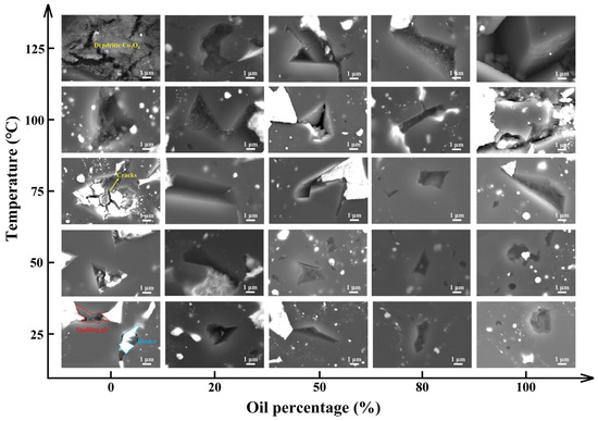 SEM images of PCD compacts tested in drilling fluids with different oil–water ratios at working temperatures ranging from 25 to 125 °C.