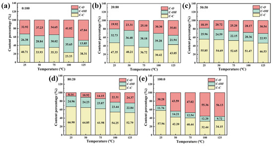 The ratio of C-O, C-O-H and C-C bond content in drilling fluids environment under working temperatures ranging from 25 to 125 °C: (a) 0:100; (b) 80:20; (c) 50:50; (d) 20:80; (e) 100:0.