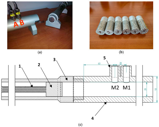 A representation of the impedance tube setup [28] along with the AlSi porous cylinders involved in this study are provided below in Figure 3a,b. Figure 3c represents the impedance tube components, where 1 is the threaded rod for fine adjustments of the sample position, 2 is the rigid termination, 3 stands for the sample holder tube, 4 represents the microphone and loudspeaker tube and 5 is the microphones’ (M1 and M2) holder.