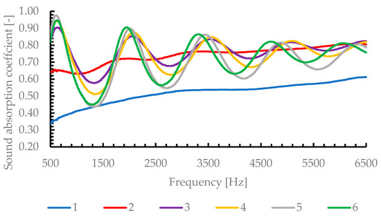 Narrow band spectrum α = α(f)—1–6 represents the samples ordered ascendingly in function of mean pore diameter (according to Figure 3b).