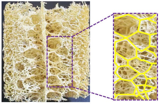 The irregularity of cellular structures has a significant influence on their mechanical behavior. Cellular structures with irregular geometries can even surpass closed-cell foam materials in compressive performance [26]. It is noteworthy that conventional cellular structures typically exhibit anisotropic energy absorption characteristics, whereas the application of an irregularization treatment can enhance both their isotropic response and energy absorption efficiency [27,28]. Against this background, the distance-metric-based Voronoi diagram, as a spatial partitioning method, demonstrates unique potential [29,30]. This configuration appears in 3D space as a non-periodic network composed of polyhedral cells, which exhibit statistical variations in face count, edge count, and vertex connectivity, forming a continuously interconnected pore system through shared geometric elements. This geometric irregularity endows the Voronoi model with high design flexibility, making it valuable in fields such as hollow-structure modeling, mechanical property optimization, and lightweight design [31]. Various mechanical configurations have been developed based on Voronoi diagrams, which can be categorized according to spatial morphology into skeleton-cubic types [32,33], foam-like types [34,35,36], and composite-filled types [37,38,39]. These structures demonstrate exceptional mechanical performance, characterized by their distance-based partitioning system that inherently generates an efficient space-filling pattern. This design strategy not only integrates lightweight and high-strength properties but also optimizes material distribution to minimize redundancy, thereby significantly enhancing overall stiffness and deformation resistance [40]. Furthermore, the continuity of connections between the polygonal units contributes to improved structural stability, facilitating uniform load distribution and mitigating localized stress concentration under applied forces. In 3D space, the Voronoi diagram manifests as a non-periodic network structure composed of polyhedral unit cells, whose topological characteristics closely resemble the microscopic morphology of natural porous luffa sponge (as shown in Figure 1).