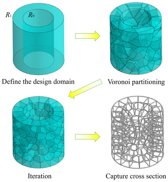 As illustrated in Figure 2, a cylindrical geometric model is established with defined dimensional parameters: inner radius R0, outer radius R1, outer diameter D1, and height H. Following this, seed points are generated within the design domain of the cylindrical volume. Based on their spatial distribution, Voronoi polyhedral partition is constructed within the modeling domain. During the initial network generation phase, the number of Voronoi seed points (N) is controlled to regulate the network density. This value of N also corresponds to the number of Voronoi cells, thereby influencing the final density of the network structure.