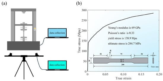 In the investigation of cellular structures, aluminum alloy serves as one primary material due to its advantageous combination of low density and manufacturability. This study characterizes aluminum alloy AA6061 fundamental mechanical properties through standardized tensile testing in accordance with ASTM E8E8M-22 [41]. Tensile specimens are fabricated using selective laser sintering (SLS) additive manufacturing, maintaining a dimensional tolerance of ±0.10 mm. The fabricated specimens exhibit a consistent average density of 2700 kg/m3. Quasi-static tensile loading is applied via a servo-electric universal testing machine (model ETM105D, WANCE Ltd., Shenzhen, China) with 100 kN load. Full-field strain measurement is accomplished via a non-contact approach using three-dimensional digital image correlation, with the experimental setup depicted in Figure 3a. Utilizing this optical method allows for precise quantification of deformation. The mechanical response of AA6061 is illustrated in Figure 3b. It is represented by the averaged engineering stress–strain curve obtained from repeated tests.
