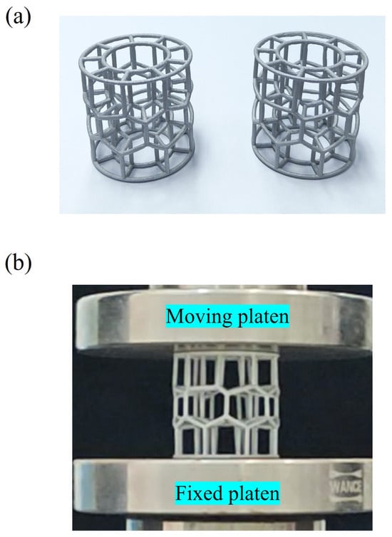 The two specimens employed for compression testing are presented in Figure 4, which fabricated from aluminum alloy AA6061. Their geometric dimensions are defined as follows: a wall thickness of d = 2 mm, R0 = 15 mm, R1 = 25 mm, and H = 50 mm. Considering the current process constraints of additive manufacturing, a conservative meshing density (N = 25) is adopted to minimize potential forming defects associated with high-density fine cellular structures. The measured masses of the two specimens are 18.64 g and 18.35 g, respectively, as determined by a precision balance. The resulting mass deviation of less than 2% indicates a high level of manufacturing repeatability.