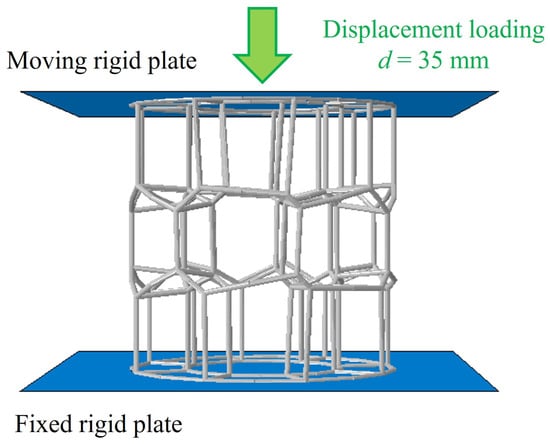 A finite element model is developed to simulate the compression process of the BVT, as illustrated in Figure 5. The model comprises three main components: a moving rigid plate, a stationary supporting rigid plate, and the BVT structure. Both the upper and lower plates are modeled as analytical rigid bodies. The upper plate is assigned a constant downward velocity of 30 mm/s, while the other is constrained. The lower supporting plate is fully fixed in all degrees of freedom. General contact is applied throughout the model to account for interaction effects, utilizing a friction coefficient of 0.2 [43,44] in the tangential direction of contacting surfaces and a hard-contact condition in the normal direction. Moreover, beam element is employed for numerical simulation owing to their high computational efficiency and convenience in parametric design and iterative optimization, which is accepted in the preliminary design and optimization of porous structures. Through systematic convergence analysis, an optimal element size of 0.7 mm is determined. To ensure consistency between the simulation and experimental conditions, the loading displacement is strictly set at 35 mm in accordance with the testing standard.