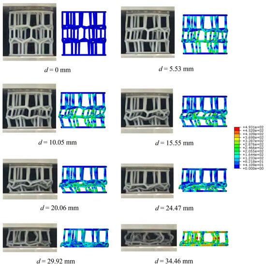 The comparative analysis between simulation and experimental results (Figure 6) reveals that the experimentally measured force–displacement curve enters the densification stage earlier than its simulated counterpart. This discrepancy is primarily attributed to the reduced sensitivity of the beam-element modeling approach to cross-sectional dimensions, which in turn delays the simulated structural contact response relative to the experimental test. However, the energy absorption curve in Figure 6b exhibits only minor deviations between the simulation and experiment, indicating the high computational accuracy of the finite element model.