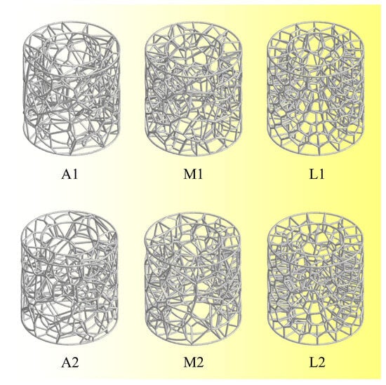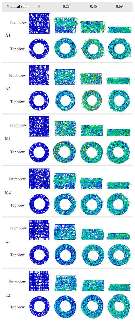 To examine the effect of optimization iteration times on the energy absorption performance of BVT structures, this section compares the energy absorption capacities of structures generated with different numbers of iterations. As illustrated in Figure 8, three groups of BVT structures are constructed with the same geometric parameters (d = 1 mm, N = 125, R0 = 15 mm, R1 = 25 mm, H = 50 mm) but varying iteration times. Each group contains two samples for comparative analysis: the base group (A1, A2) retains the initial network without iteration; the moderate-iteration group (M1, M2) undergoes 10 optimization iterations; and the high-iteration group (L1, L2) undergoes 50 optimization iterations. With increasing iteration count, the network distribution of the BVT structures progressively becomes more uniform. Finite element simulations are then conducted to analyze the mechanical responses of all structures under axial compression.