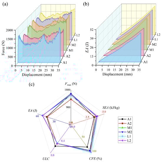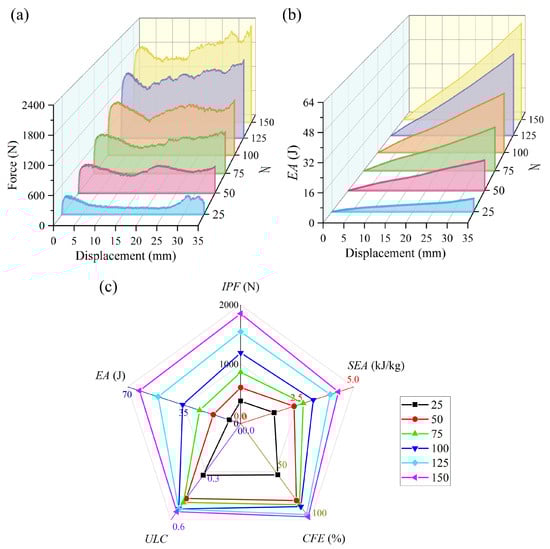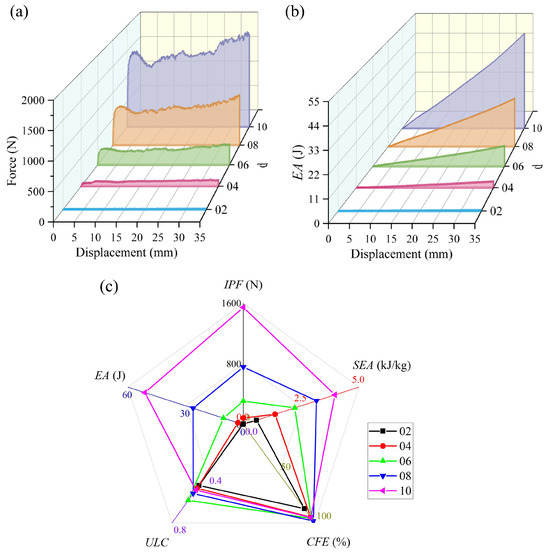 Comparison of energy absorption performance of BVT for different cross-sectional diameters at N = 125: (a) force–displacement curves, (b) energy absorption curves, (c) energy absorption performance indicators.