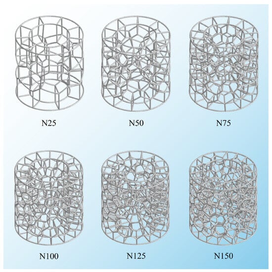 This section examines the influence of N of Voronoi units on the energy absorption performance of the BVT structure. Under fixed geometric parameters (d = 1 mm, R0 = 15 mm, R1 = 25 mm, and H = 50 mm), the configurations of BVT structures with different N are illustrated in Figure 11 (where the label N25 corresponds to the BVT structure with N = 25, and so forth). As can be inferred from the analysis in the previous section, increasing the number of iterations improves the structural performance, which stabilizes after 10 iterations. To eliminate the effect of iteration times, all structures used for comparative study have been optimized over 50 iterations. It is evident that an increase in the N leads to a significant rise in the relative density of the BVT structure, and its morphology gradually approaches the porous structure of the natural luffa sponge.