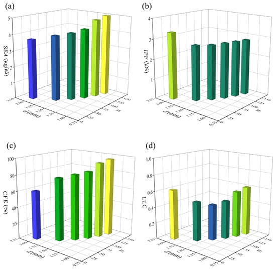 Comparison of energy absorption indicators of BVT under equal mass conditions: (a) SEA, (b) IPF, (c) CFE, (d) ULC.