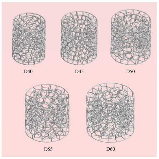 Six BVT structures with identical mass but different outer diameters are constructed, as illustrated in Figure 16. The labeling follows the convention where D40 corresponds to the structure with D1 = 40 mm. To account for the effect of increased outer diameter on the density of the network structure, N in each structure is controlled at 150. Detailed geometric parameters can be found in Table 2.