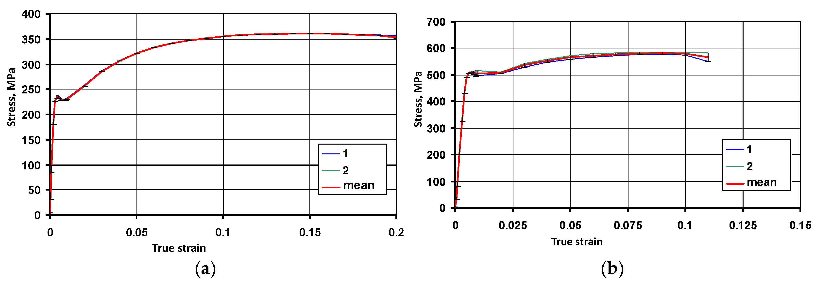 | Steel Grade | Conventional Yield Strength Ys, MPa | Tensile Strength UTS, MPa | Young’s Modulus E, GPa | Maximum Absolute Error Δ, MPa | Maximum Relative Error δ, % |
