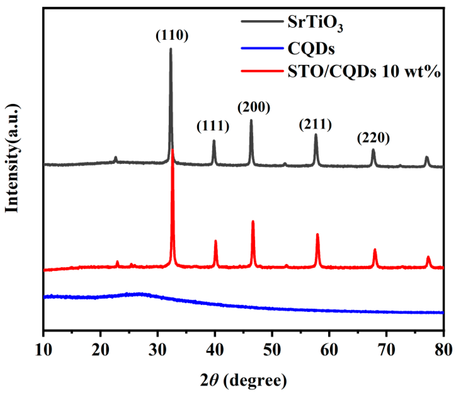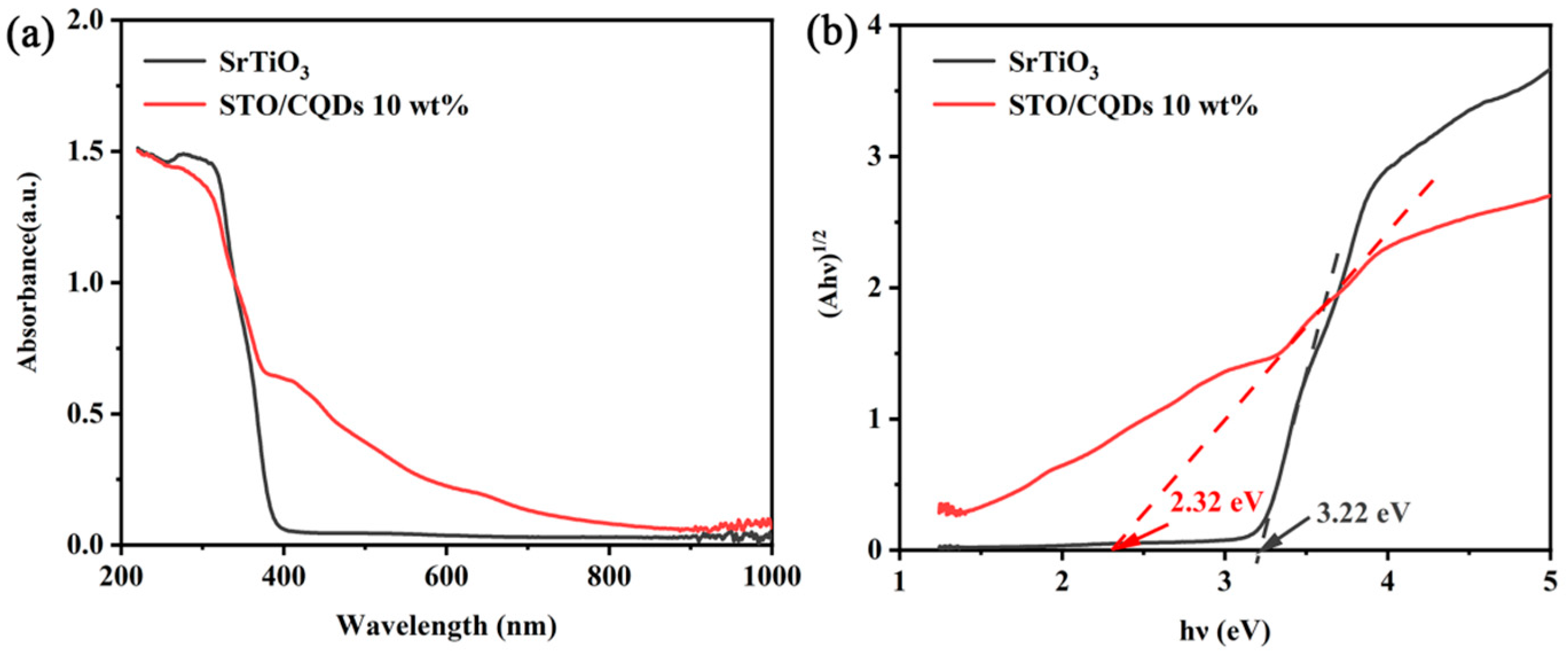 3.1. Phase Structure of SrTiO3/CQD Nanomaterials