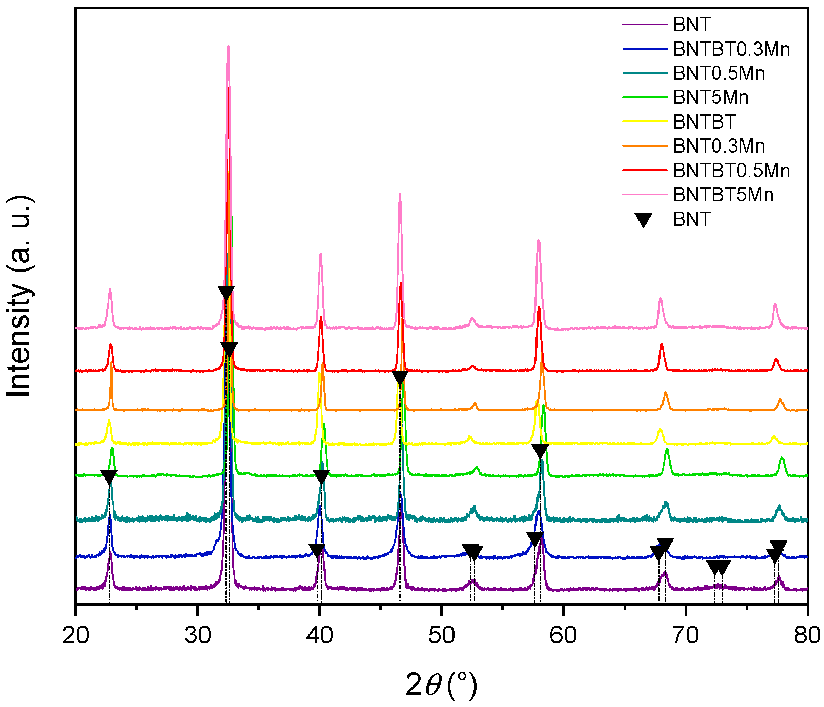 - Mn doping preserves single-phase perovskite structure in BNT and BNT-BT ceramics.