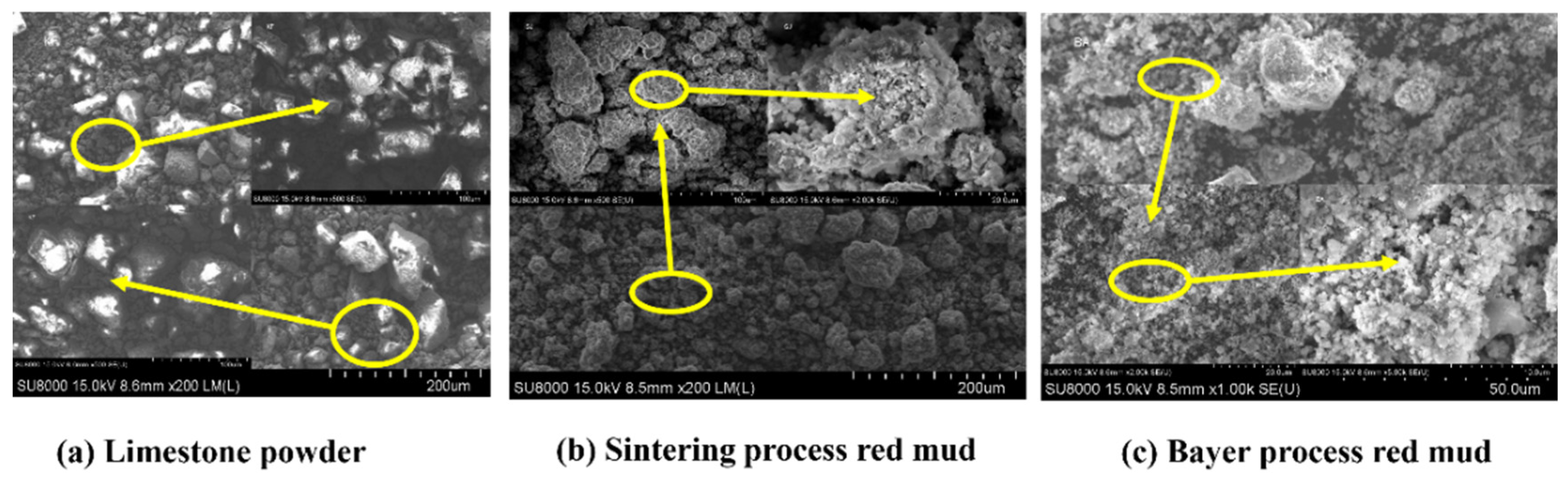- Microstructural and pore-structure analyses reveal that both types of red mud possess rougher surface morphologies, more developed pore networks, and significantly higher specific surface areas and pore volumes compared with limestone powder. The particle size distribution of red mud is wider than that of limestone due to its agglomeration.
