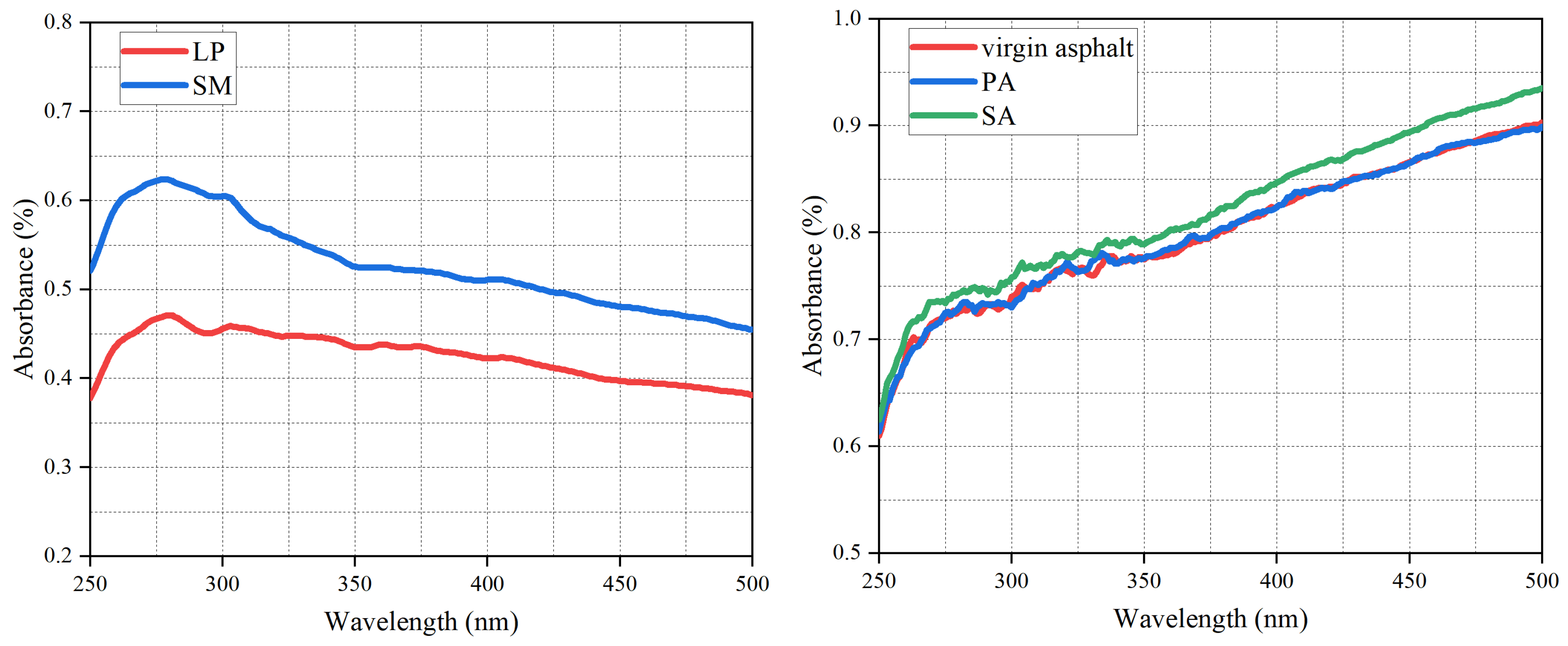 - FTIR and GPC results indicate that the layered surface of sintered red mud selectively adsorbs low-molecular-weight asphalt components, such as saturates and aromatics, which contribute to its ability to mitigate thermo-oxidative aging. Moreover, UV-vis spectroscopy confirms that sintered red mud significantly reduces ultraviolet transmittance and increases light reflection, thereby enhancing the UV aging resistance of asphalt.
