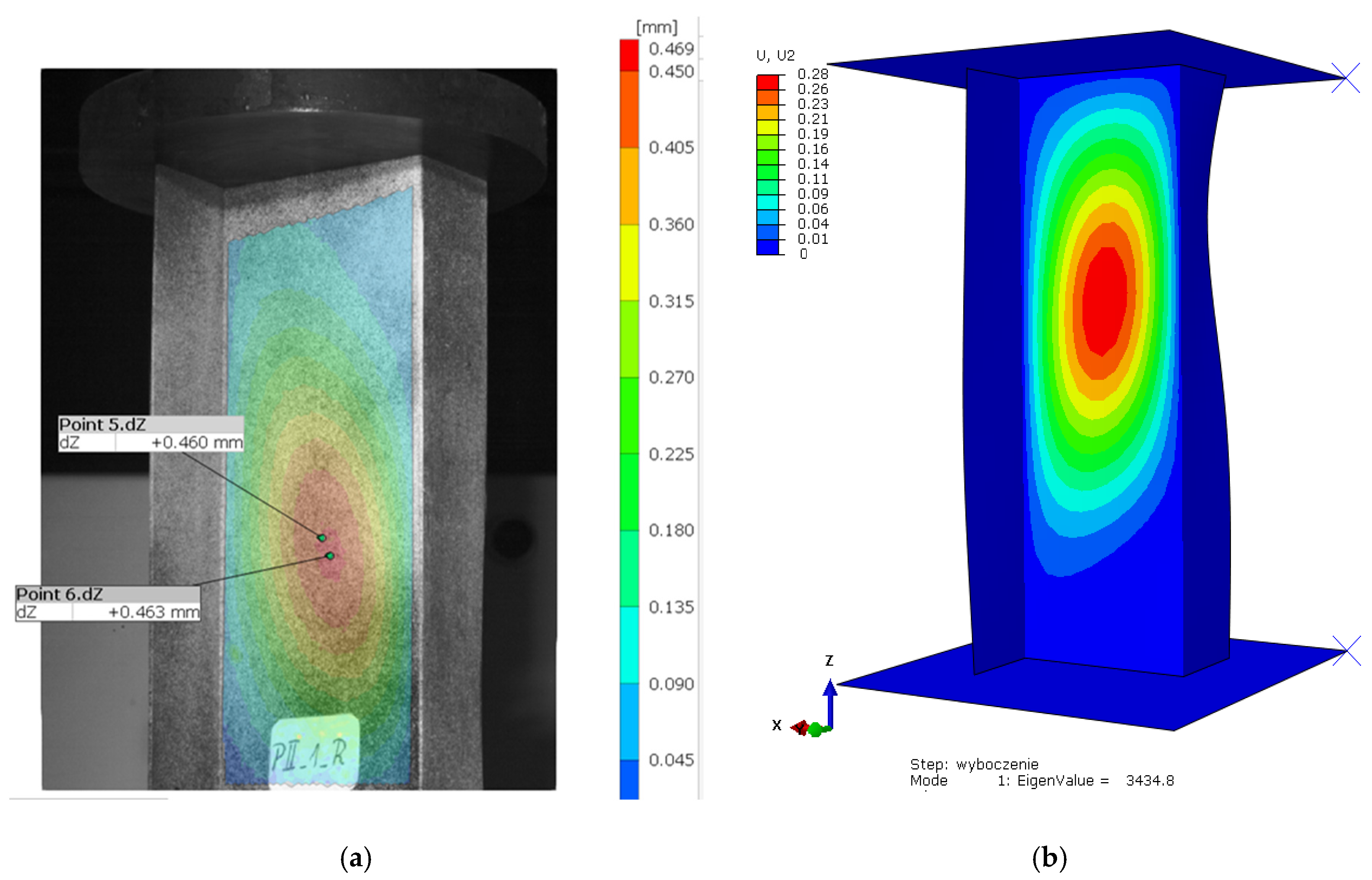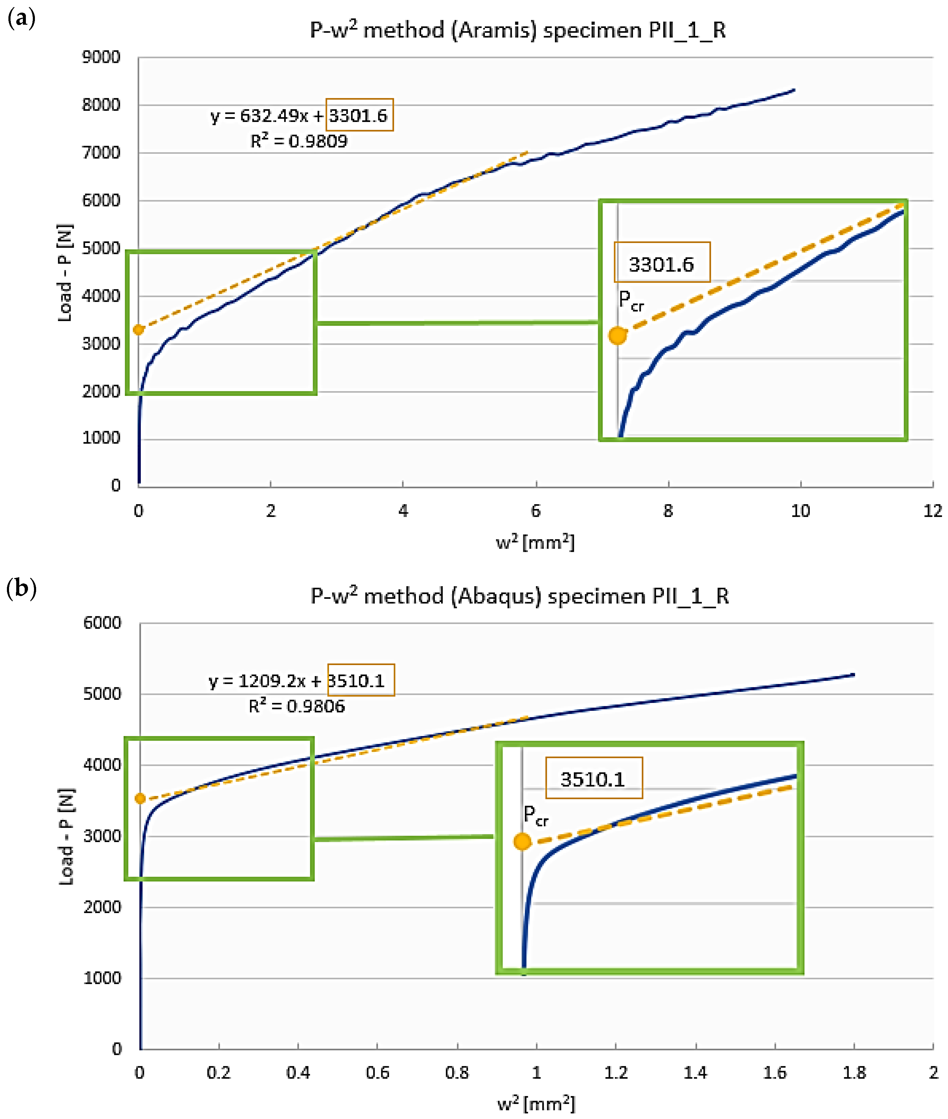 In this study, the critical load was determined based on the experimental postbuckling path describing a load vs. deflection relationship, where the load value was read directly from the testing machine and the deflection was measured using the ARAMIS optical system. The operation of the ARAMIS measurement system is based on digital image correlation, which means that measurements are made in a non-contact manner and do not depend on the characteristics of tested materials [