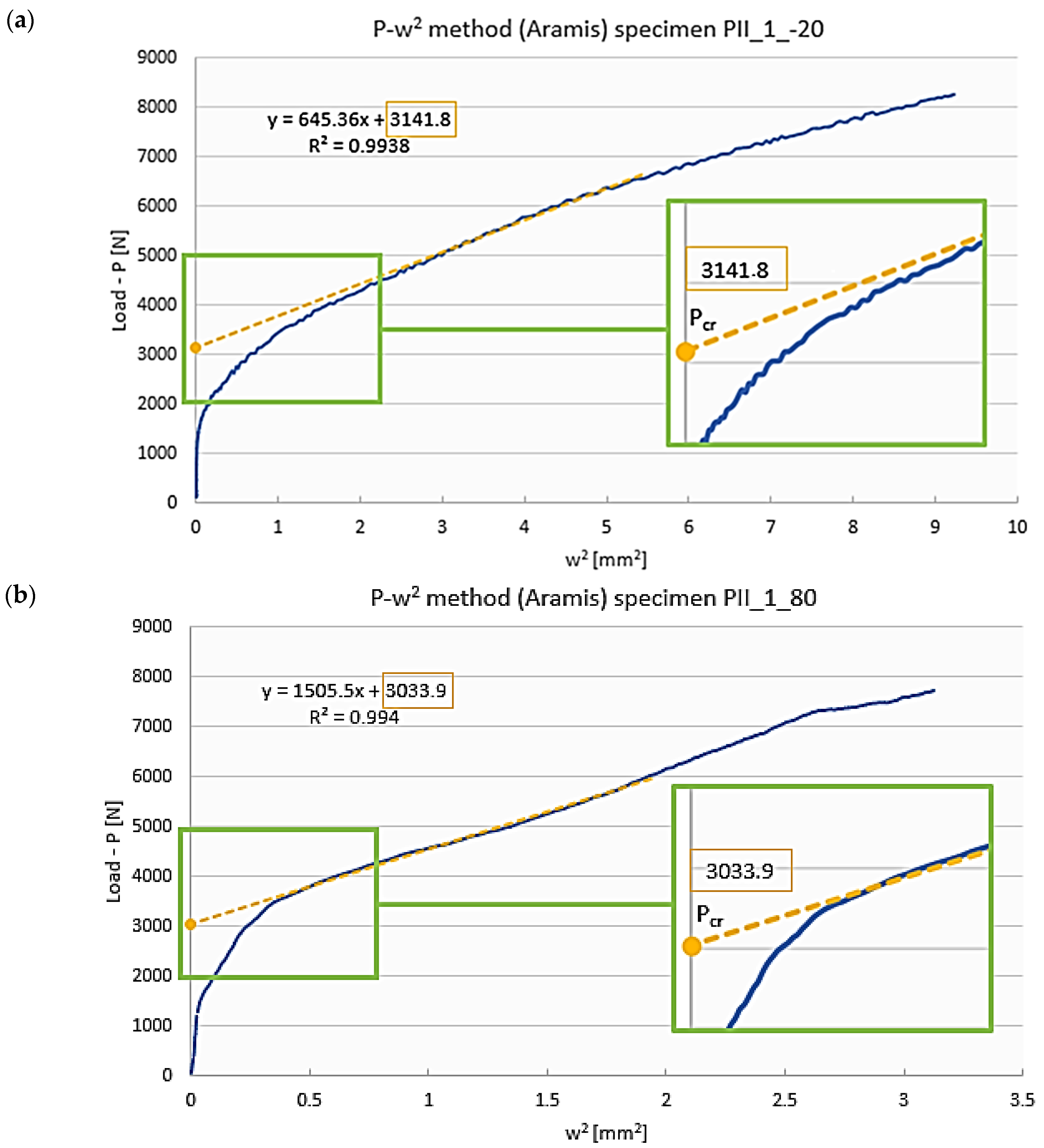 Procedure of critical load determination for a real structure (Z-section profile with the stacking sequence [0/30/45/60/90]s)—experimental results obtained at: (a) −20 °C, (b) +80 °C.