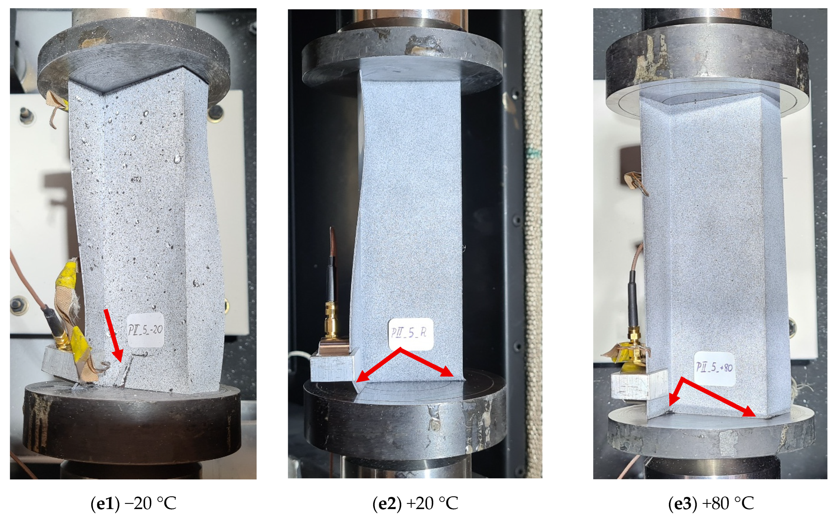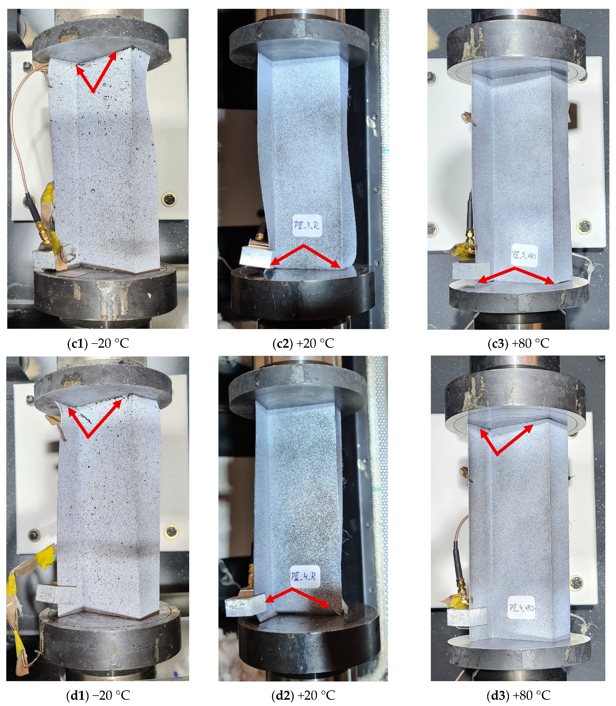 All experiments were conducted in a thermal chamber allowing the specimens to be compressed at different temperatures: −20 °C, room temperature of 20 °C, and elevated temperatures of 40 °C, 60 °C and 80 °C. Measurements at the negative temperature were made with the use of a cooling agent (nitrogen). Once the temperature in the chamber reached −20 °C, the specimen was maintained at this temperature for about 15 min prior to compression. This procedure made it possible to ensure the required temperature throughout the entire volume of the composite material. A similar procedure was followed for positive temperatures, with the specimens subjected to annealing for about 15 min at a given temperature.