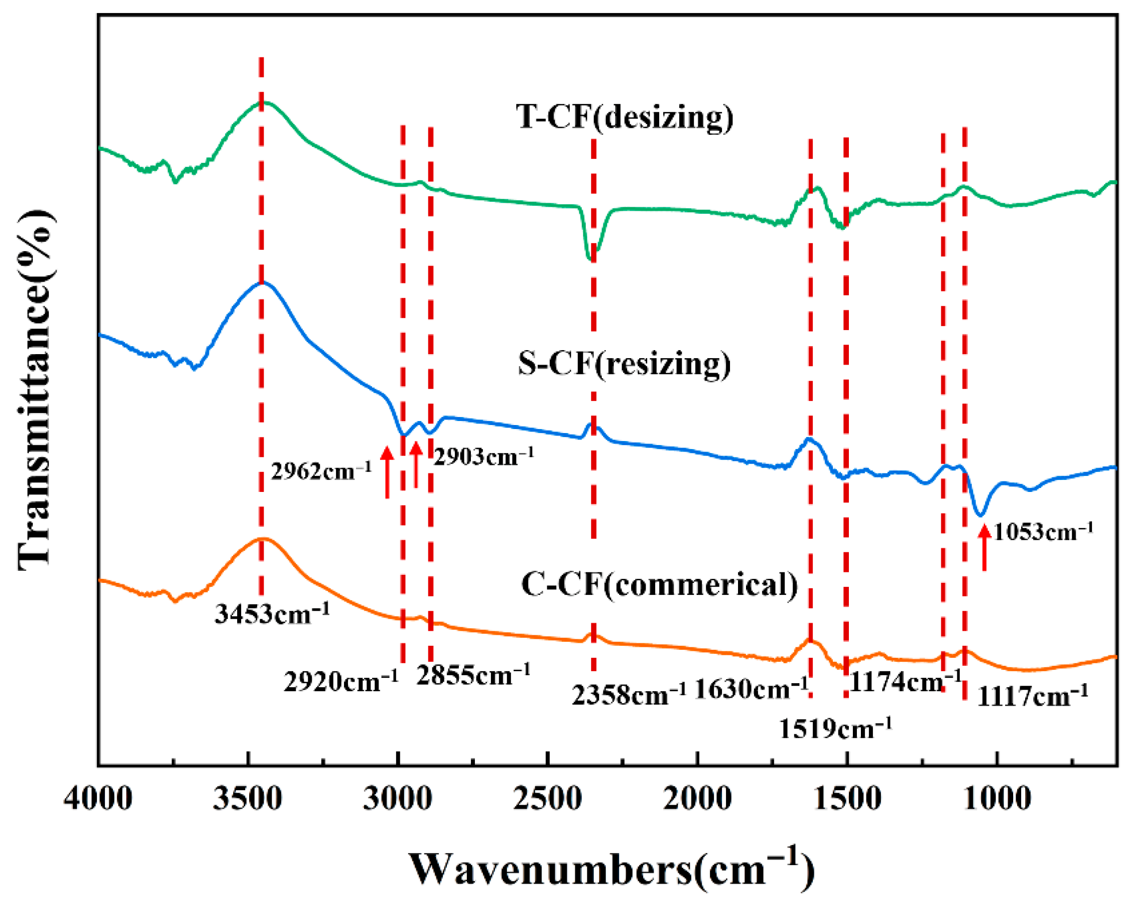The surface chemical functional groups of CFs under different treatments were investigated via FT-IR, with results shown in