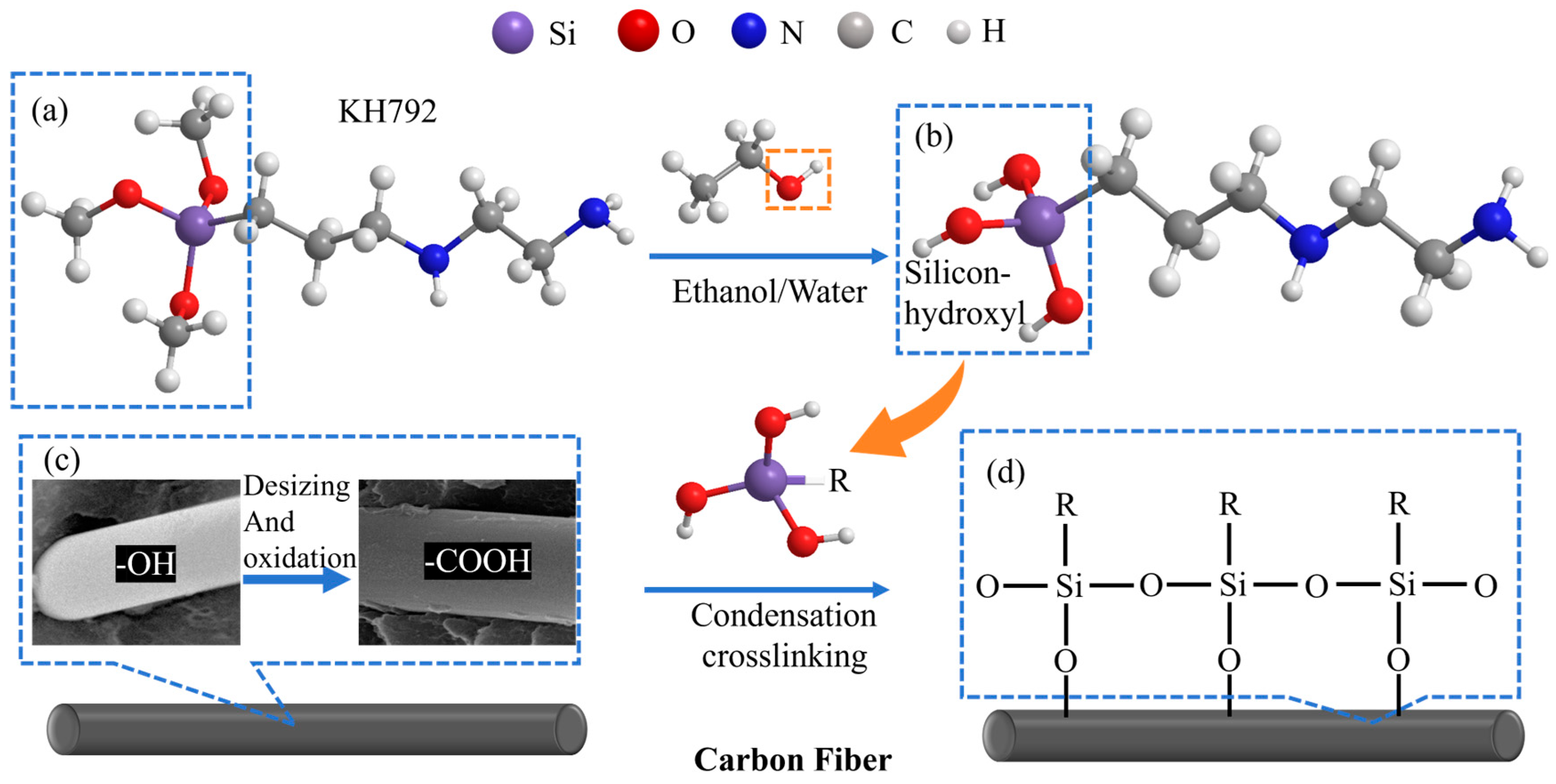 Based on these FT-IR observations, the interfacial modification mechanism of KH-792 on the carbon fiber surface can be elucidated as follows in