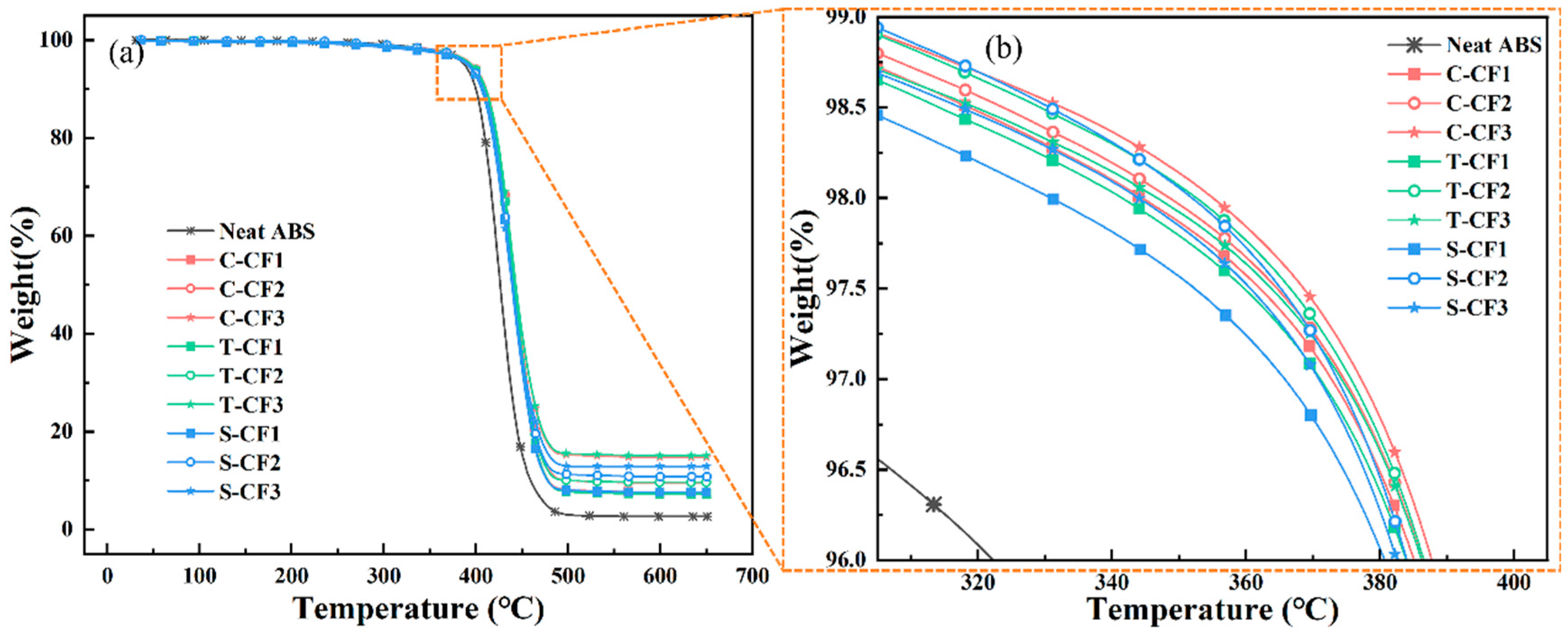 Figure 6 displays the thermogravimetric curves of carbon fiber-reinforced ABS composites with varying carbon fiber contents and different processing methods. As clearly observed in