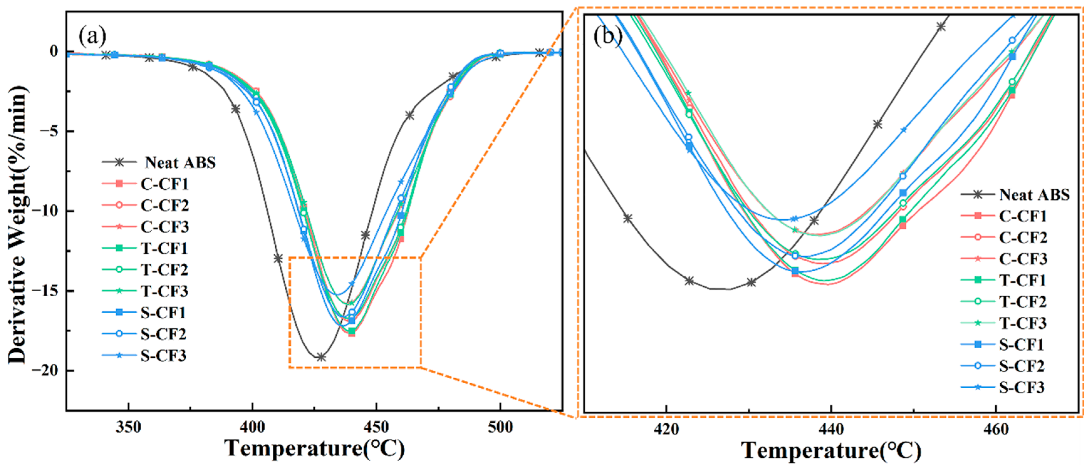 Among carbon fiber-reinforced composites processed by different methods, C-CF/ABS and T-CF/ABS composites exhibit similar maximum weight loss rates across varying carbon fiber contents. This suggests that both processing methods have comparable effects on the interaction between carbon fibers and the ABS matrix, as well as on thermal stability. However, the maximum weight loss rate of S-CF/ABS composites was higher than that of C-CF/ABS and T-CF/ABS, suggesting that surface-treated carbon fiber may exhibit more effective interaction with the ABS matrix, thereby further enhancing the thermal stability of the composite material. Additionally, the curve of the S-CF/ABS composite exhibits a leftward shift in peak temperature, which may be attributed to the slight decomposition of the sizing agent at 435 °C. Sizing agents are typically used to enhance the surface properties and processability of carbon fibers, but they may undergo some degree of decomposition at elevated temperatures, thereby influencing the thermal decomposition curve of the composite material.