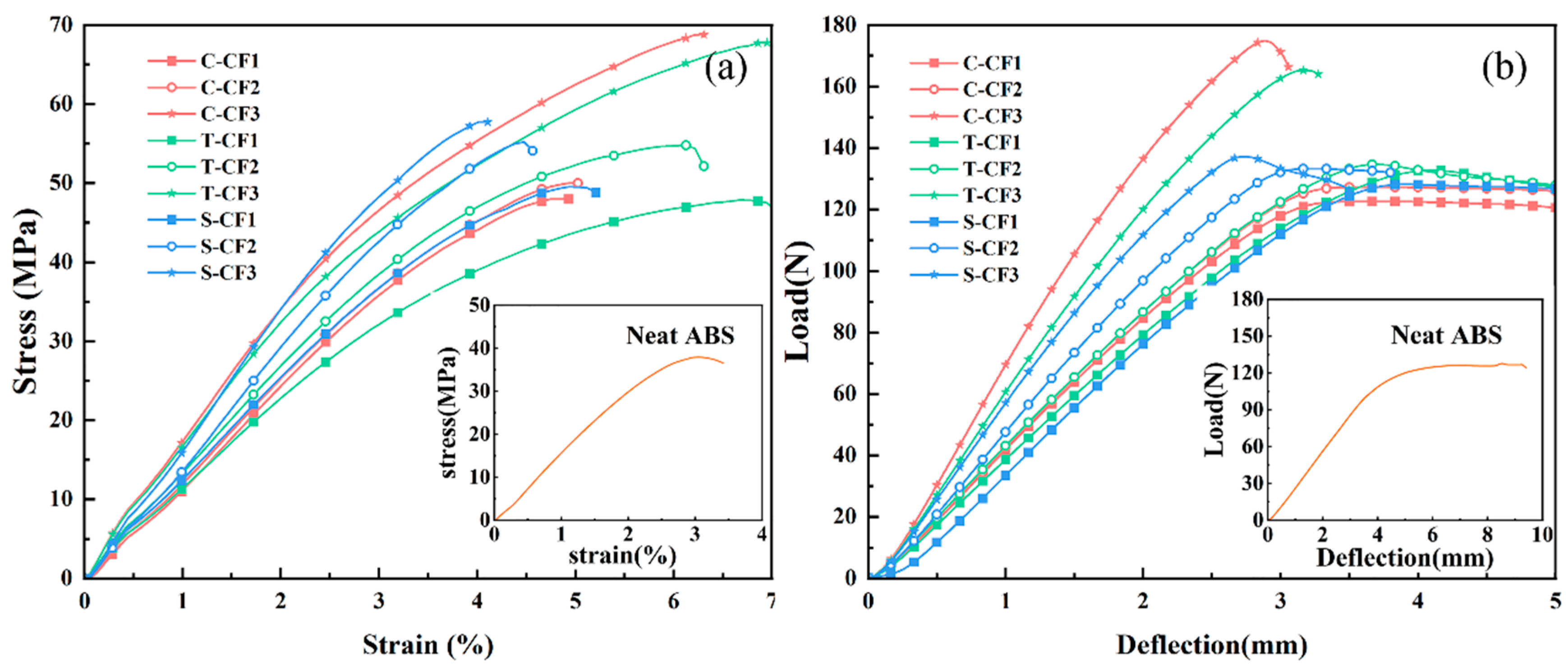 Figure 8a shows the stress–strain curve relationships for ABS-M-CFX composite material and neat ABS material. It can be observed that neat ABS exhibits superior ductility. After adding CF, all curves exhibit brittle fracture characteristics, declining after reaching peak load, and can withstand loads far exceeding the range of neat ABS, indicating a significant increase in yield strength. Among these, ABS-S-CFX exhibited higher strength than untreated CF samples, indicating that resizing achieves both improved elongation and sufficient load-bearing capacity.