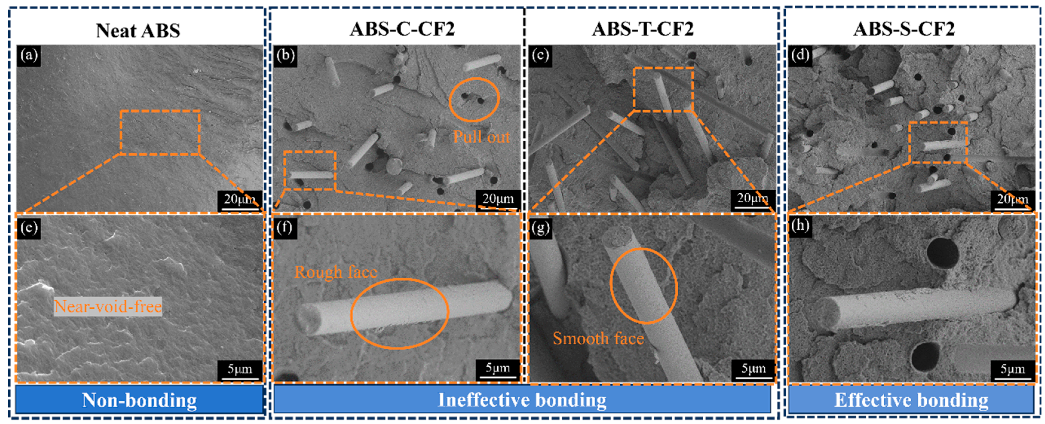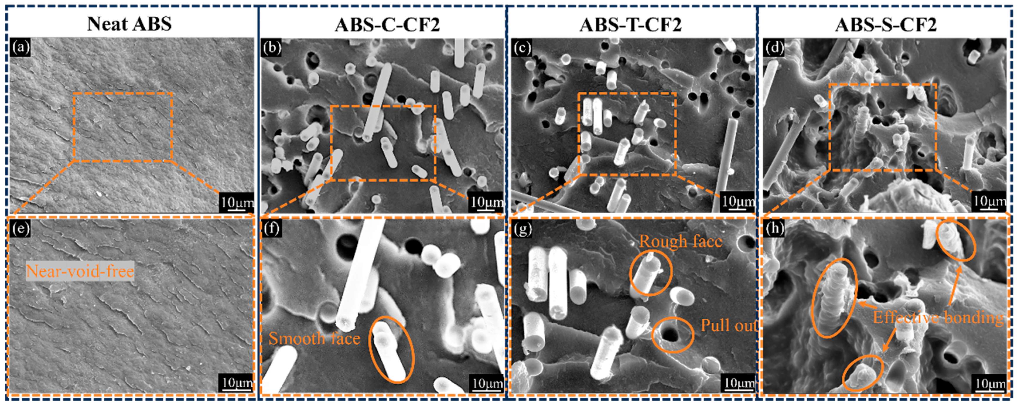 Figure 10f, the interface between the fiber and matrix is relatively clear. The fibers are cleanly pulled out from the fracture surface without resin adhesion, indicating that the wetting–bonding between the commercial sizing agent and ABS is not ideal [