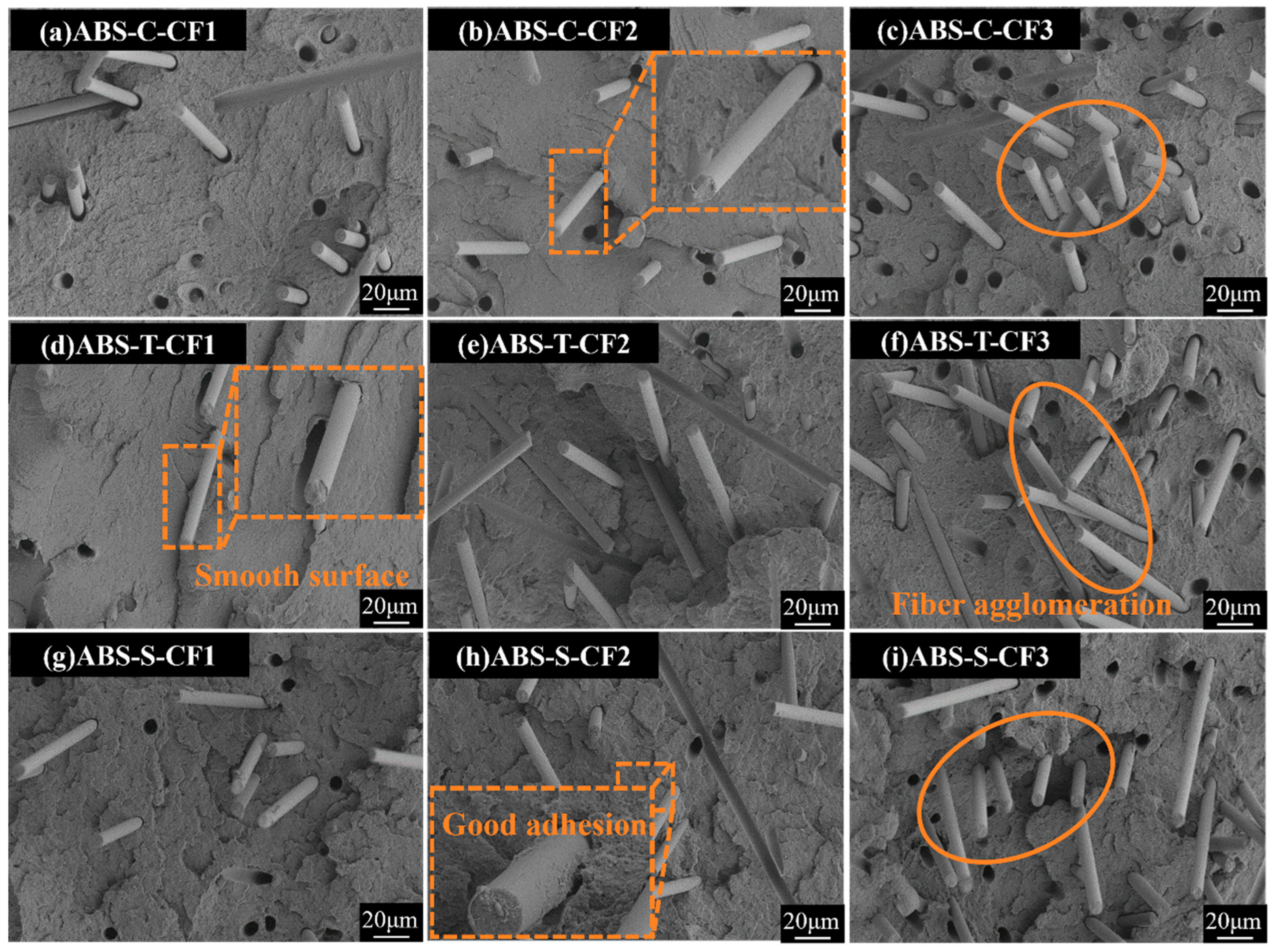 Figure 10g shows the SEM image of desizing CF-reinforced ABS at 2000× magnification. The orange dashed box highlights surface grooves on the CF, which increase surface roughness and enhance mechanical interlocking between CF and the matrix. This results in tensile and flexural strengths higher than those of commercial CF/ABS composites, as demonstrated in