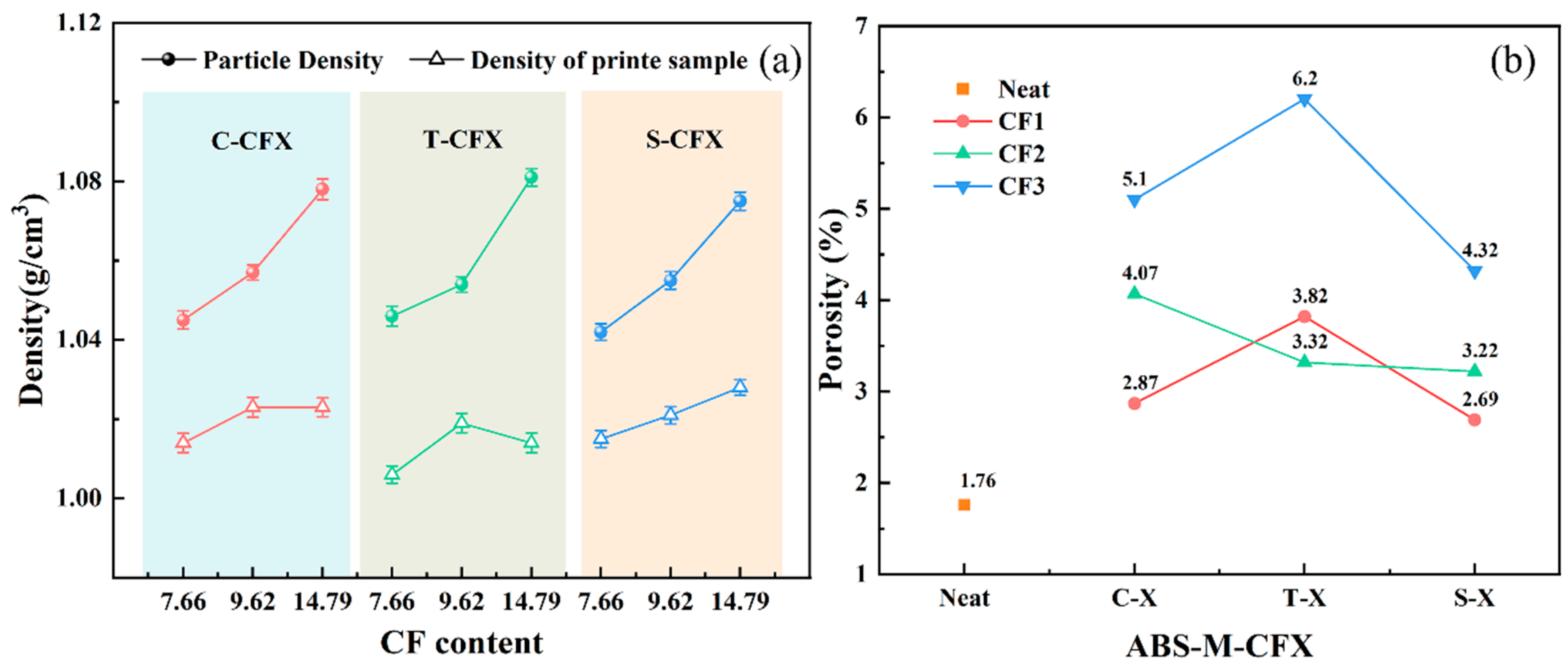 Adding fibers to pure resin materials enhances their mechanical properties, but also increases the porosity of the composite material, which further affects the overall performance of the printed product. All samples were printed under identical parameters. First, the actual density of the samples was measured based on Archimedes’ principle, with the results shown in