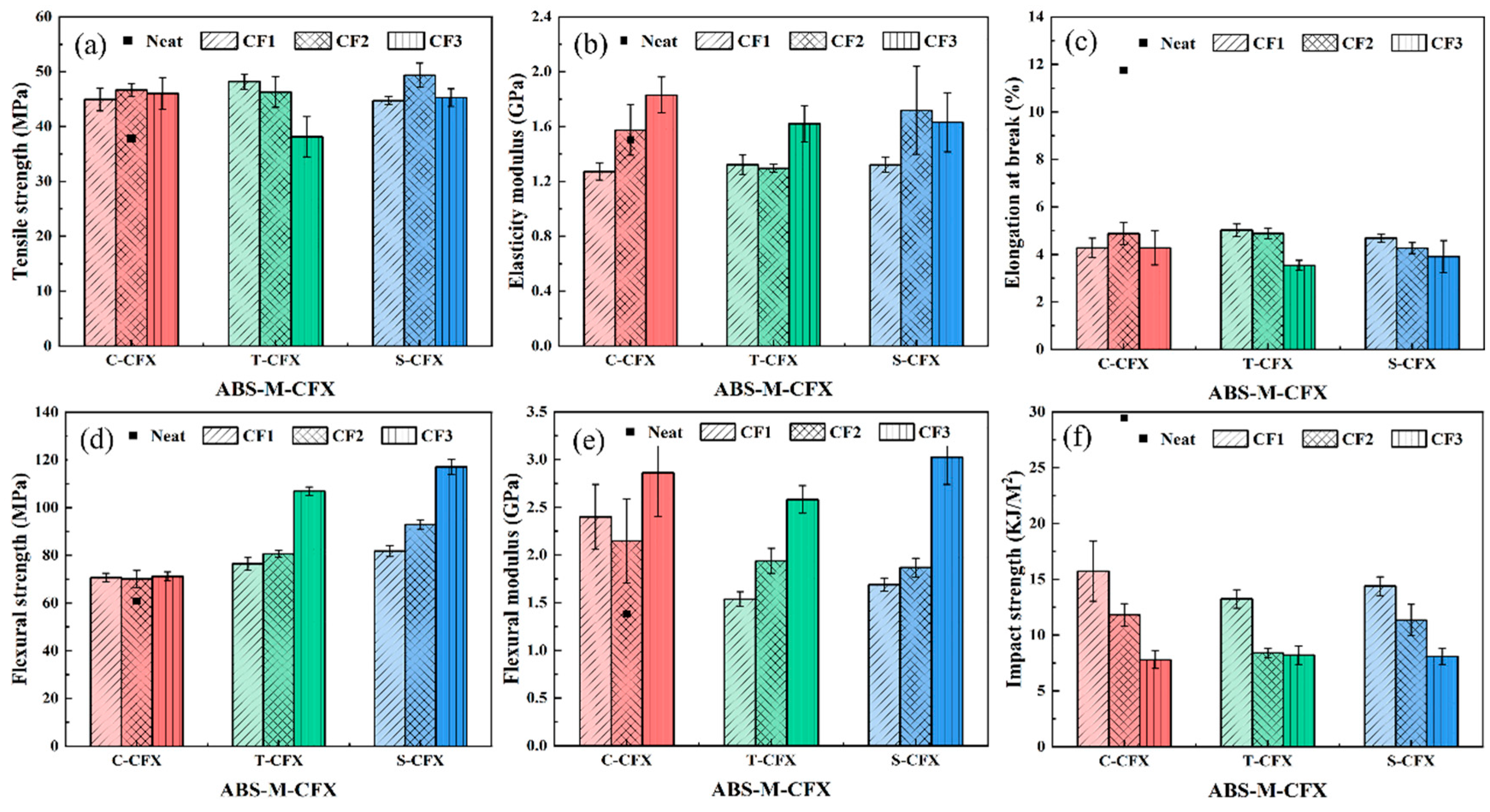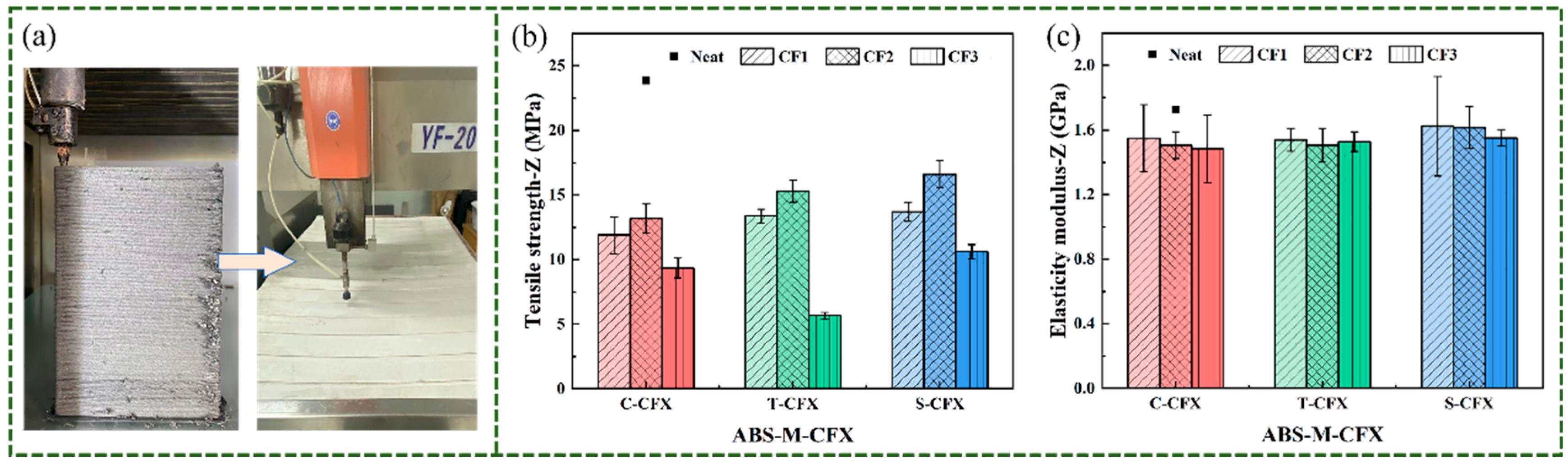 It should be noted that due to the experimental challenges associated with Z-direction specimen preparation for FDM-printed composites—including printing instability, warping, and cracking caused by the high shrinkage rate of ABS—as well as the scope limitations of the current study, the results presented herein serve as a preliminary validation that surface treatment influences interlayer bonding. Among the CF-reinforced composites, the S-CF2 specimens exhibited the highest Z-direction tensile strength. A comprehensive anisotropic characterization—including systematic Z-direction testing for all CF variants and detailed analysis of fiber alignment effects on layer adhesion versus in-plane properties—will be conducted in our future work to fully elucidate the manufacturing-process-dependent behavior of these composites.