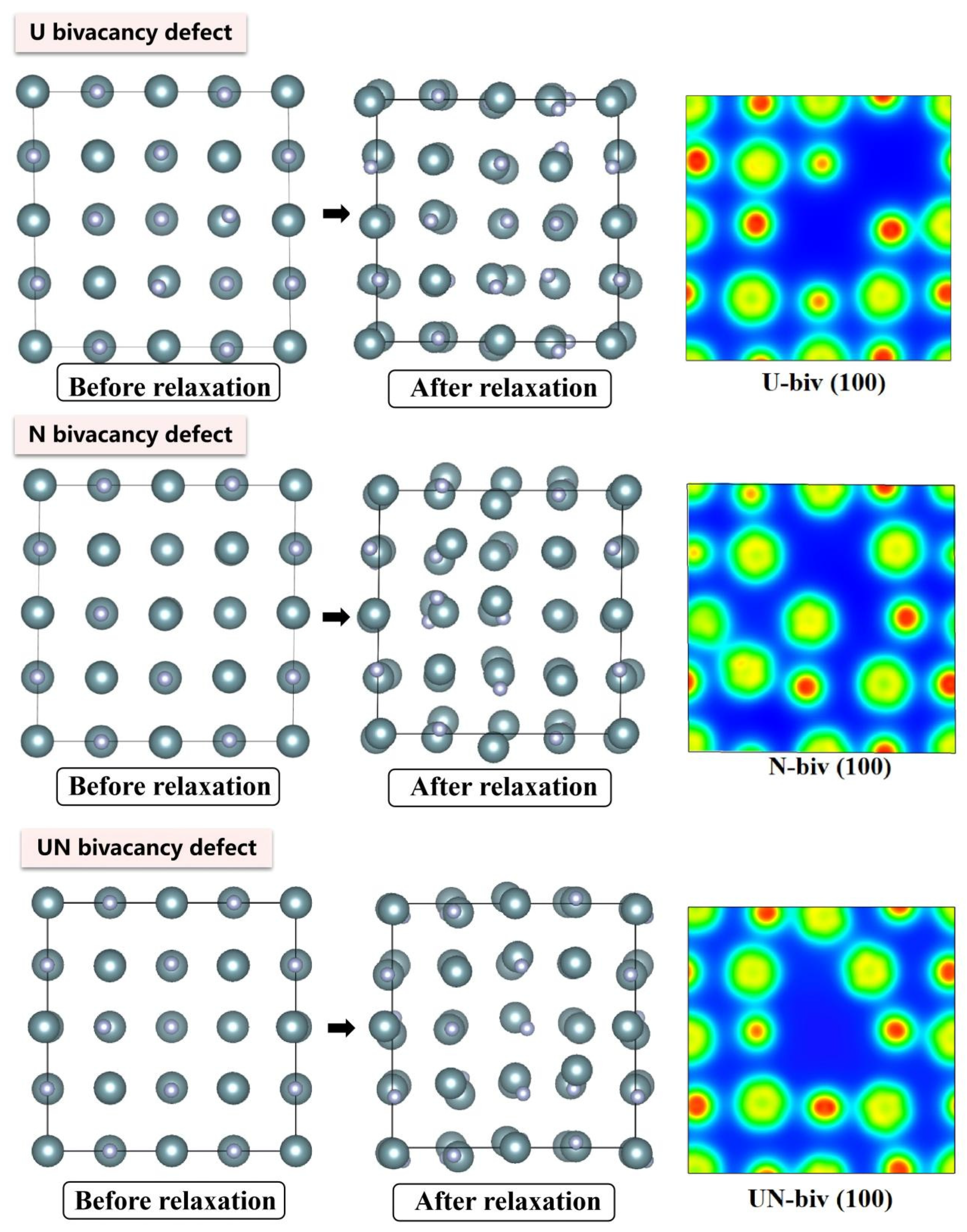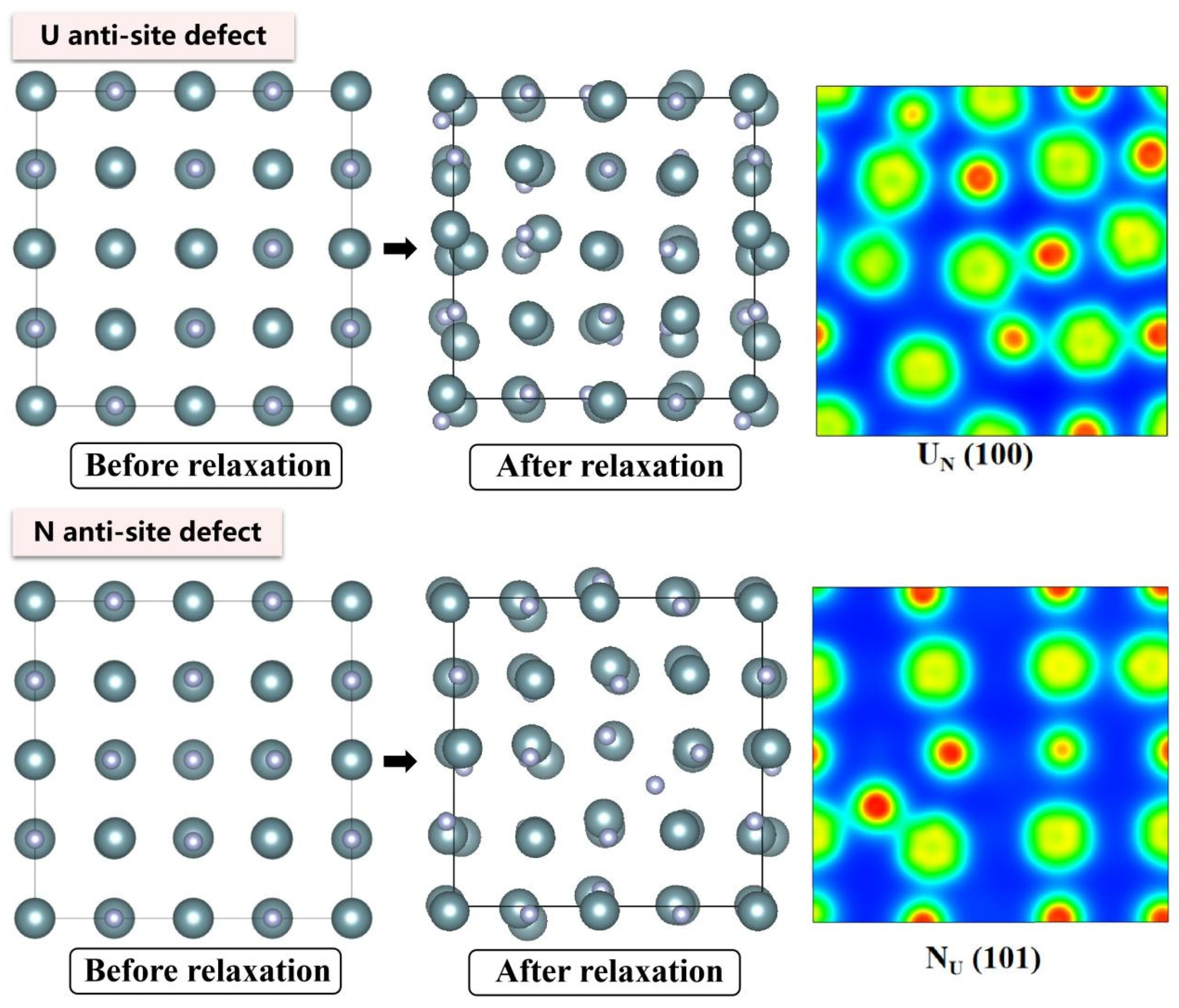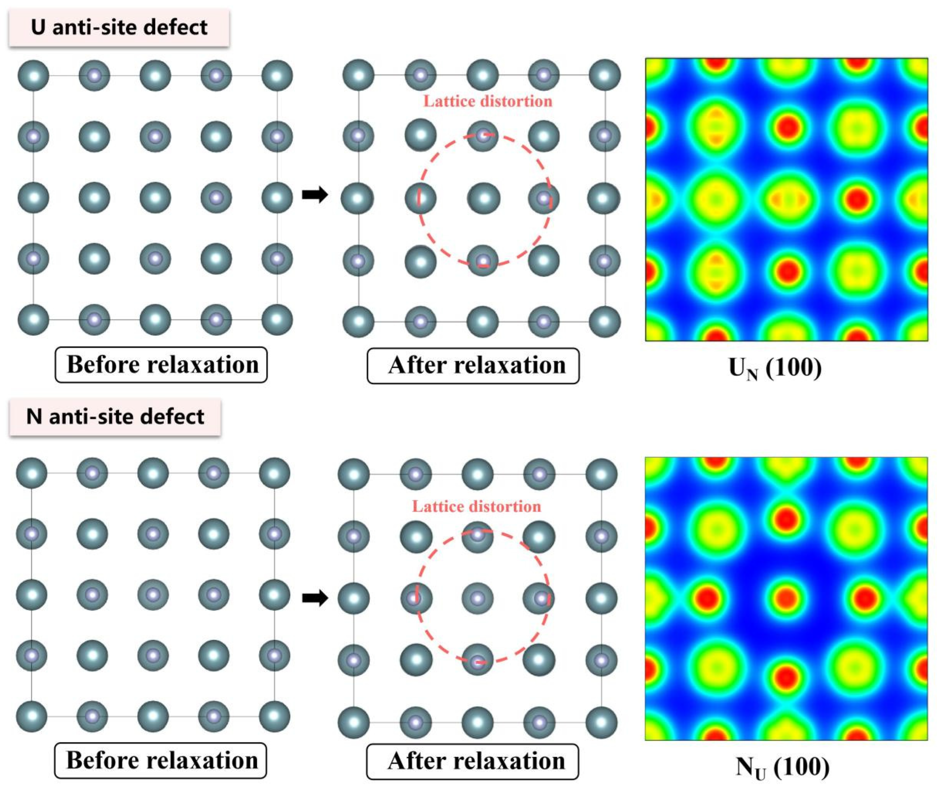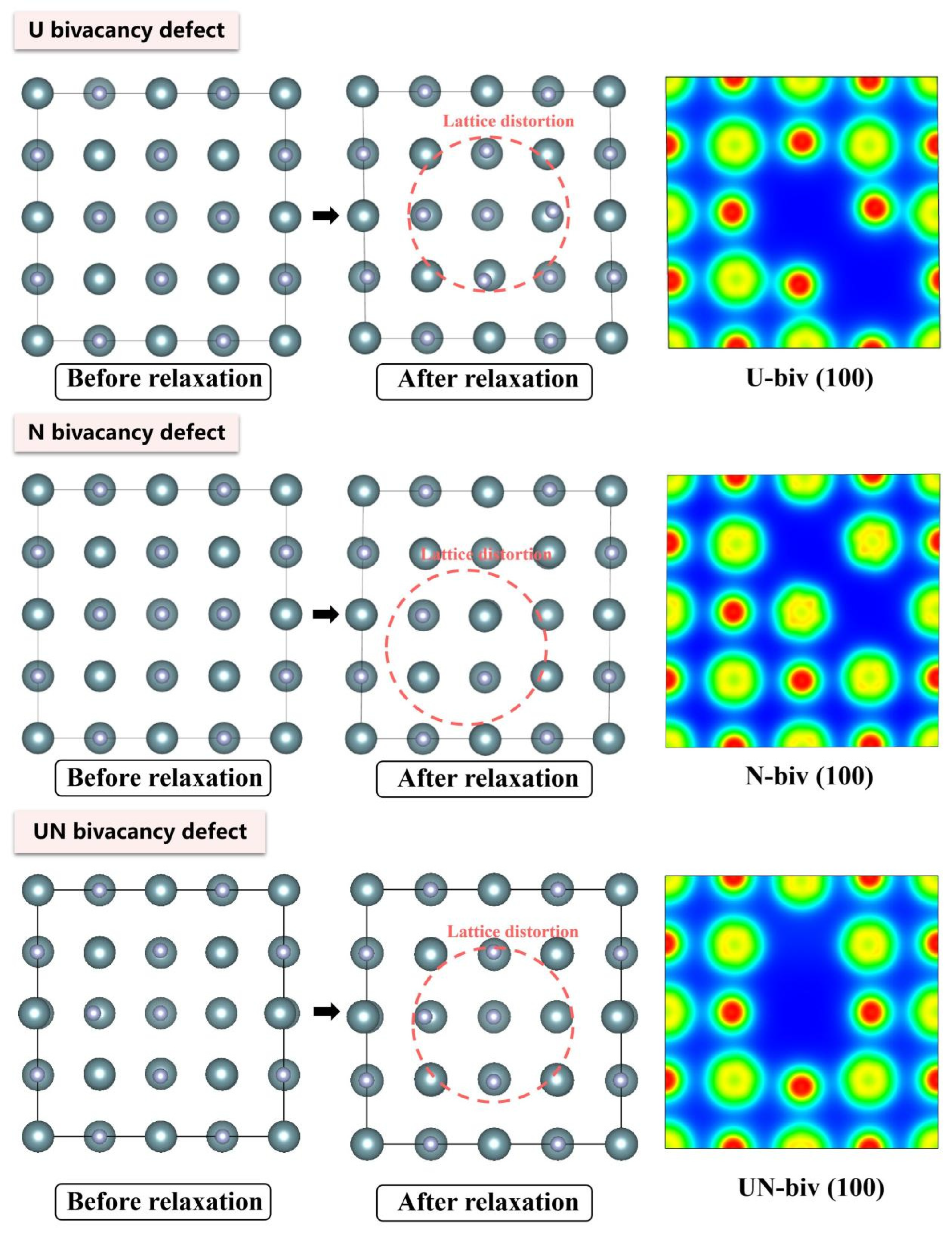 - At the 0 K absolute temperature, statistical analysis reveals that interstitial defects induce the most severe unit cell volume expansion in UN, followed by antisite defects, while divacancies and Schottky defects exert minimal influence on lattice expansion/contraction.
