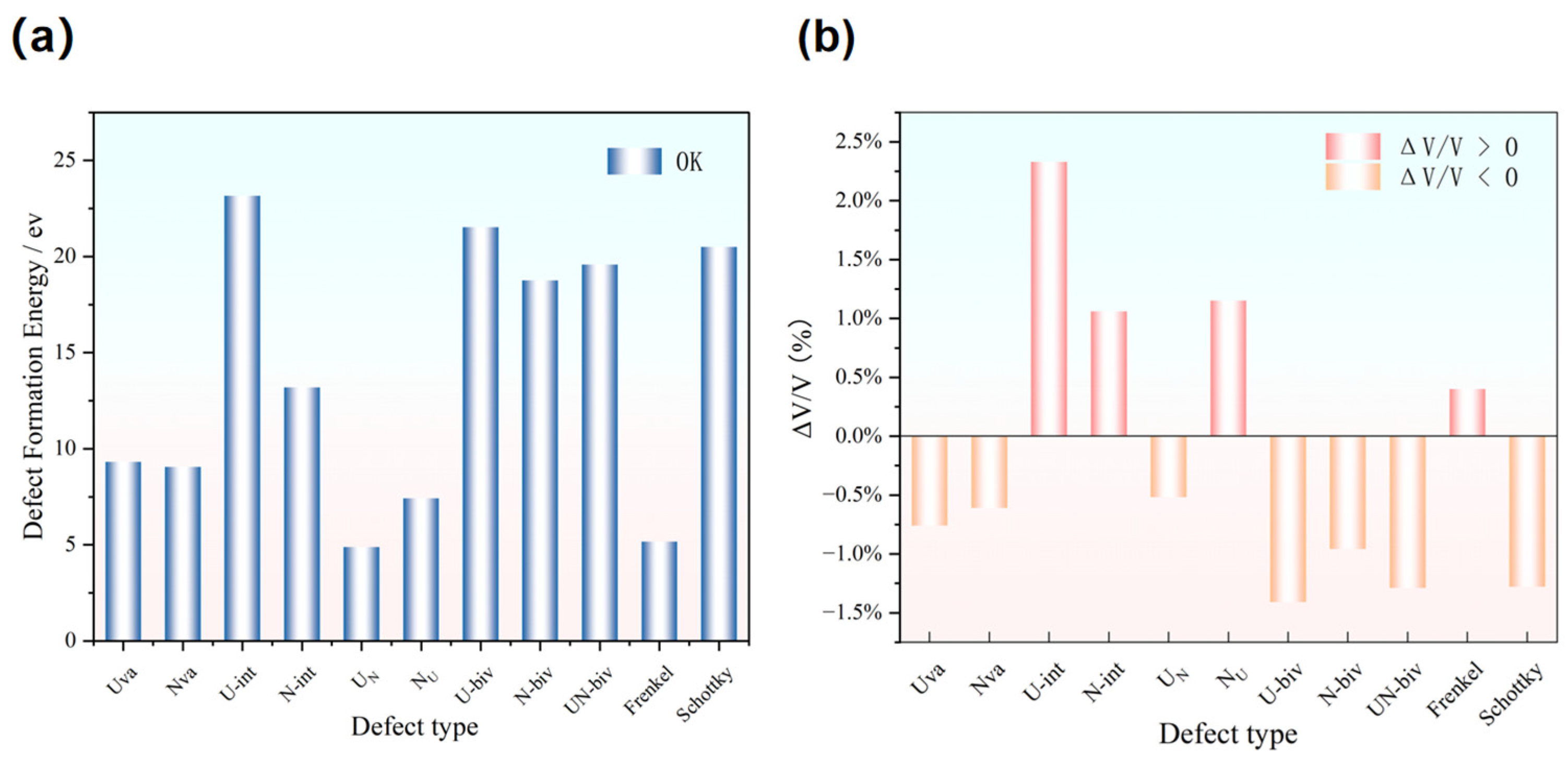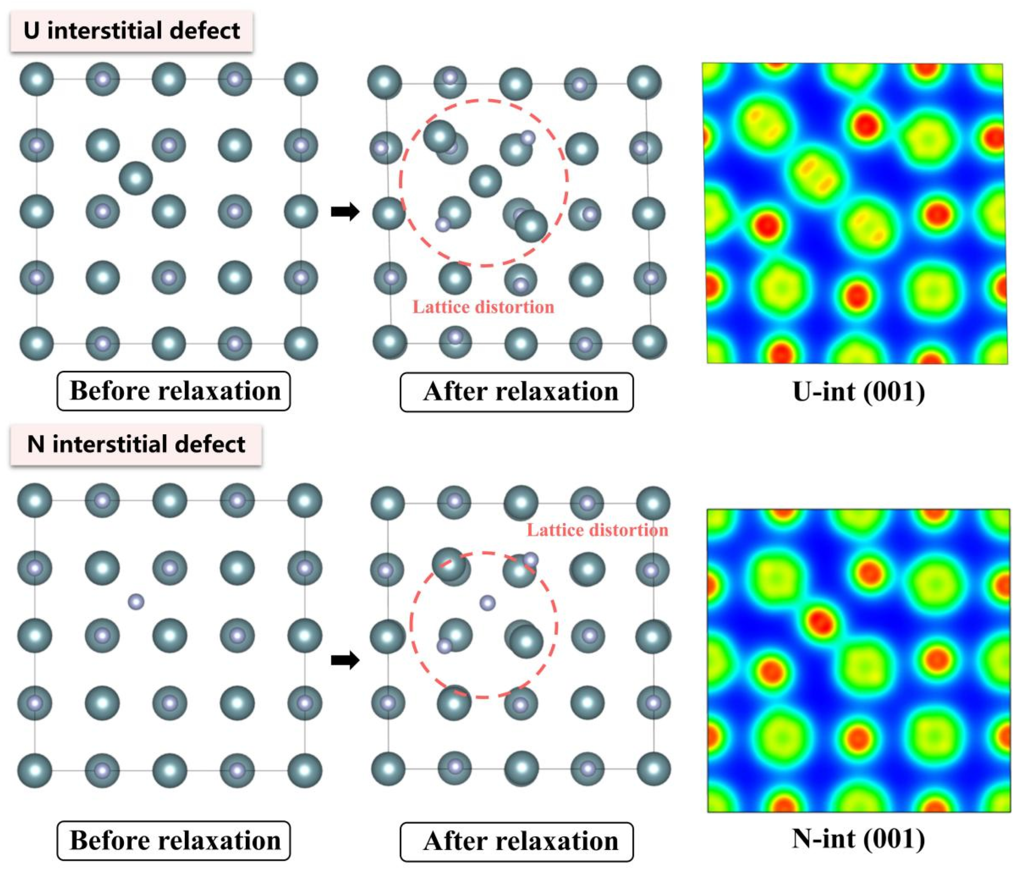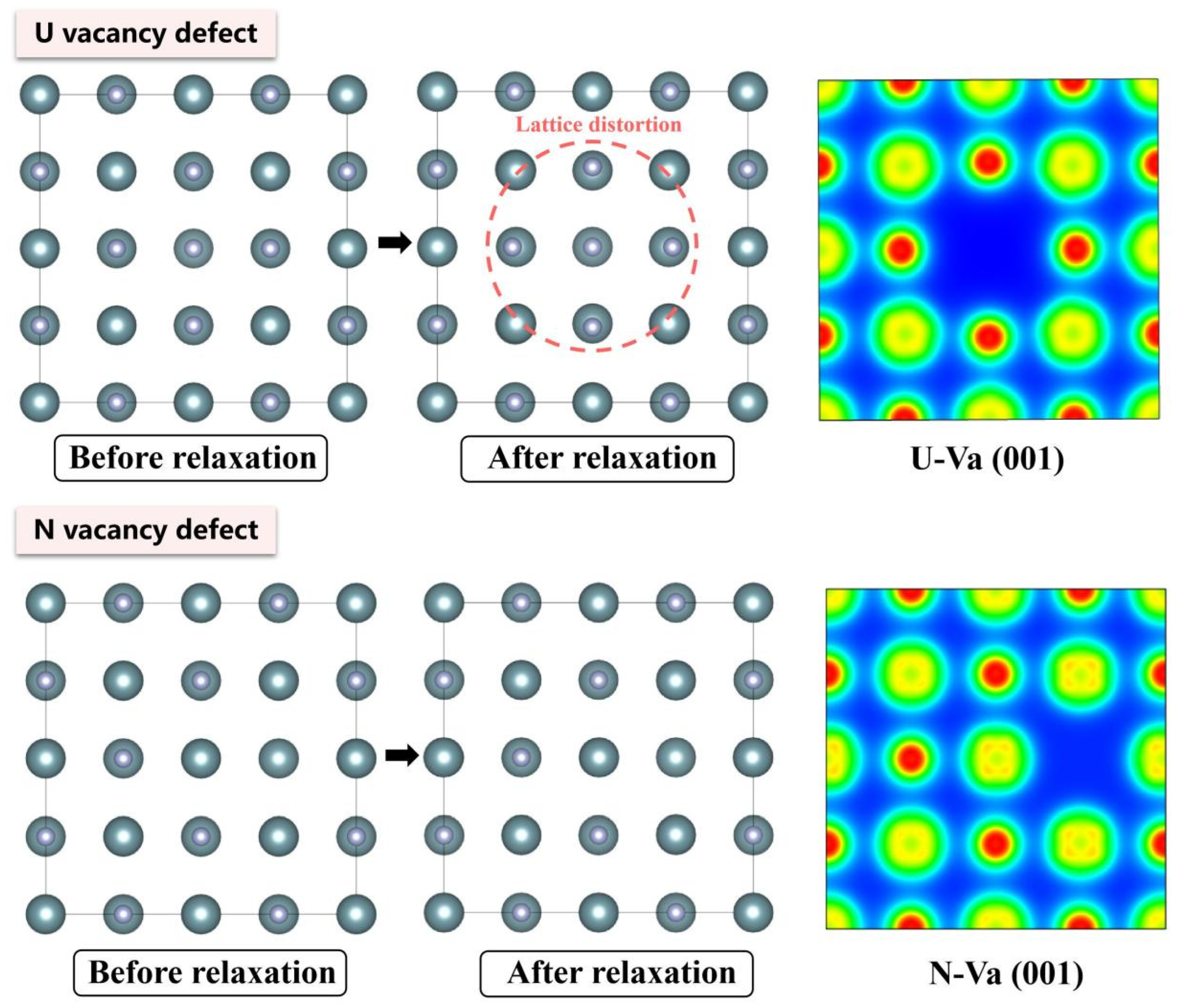 - At the 0 K absolute temperature, statistical analysis reveals that interstitial defects induce the most severe unit cell volume expansion in UN, followed by antisite defects, while divacancies and Schottky defects exert minimal influence on lattice expansion/contraction.