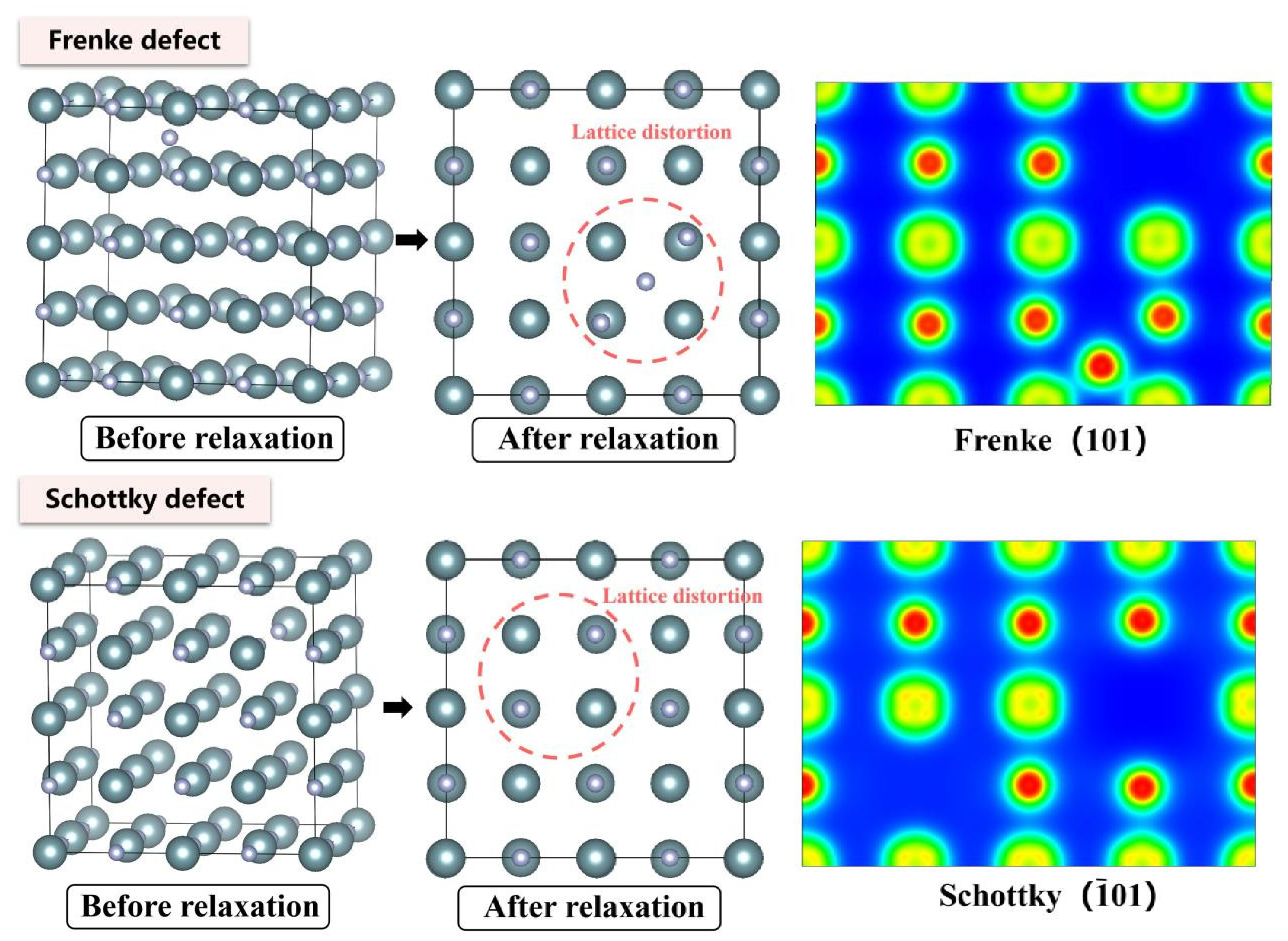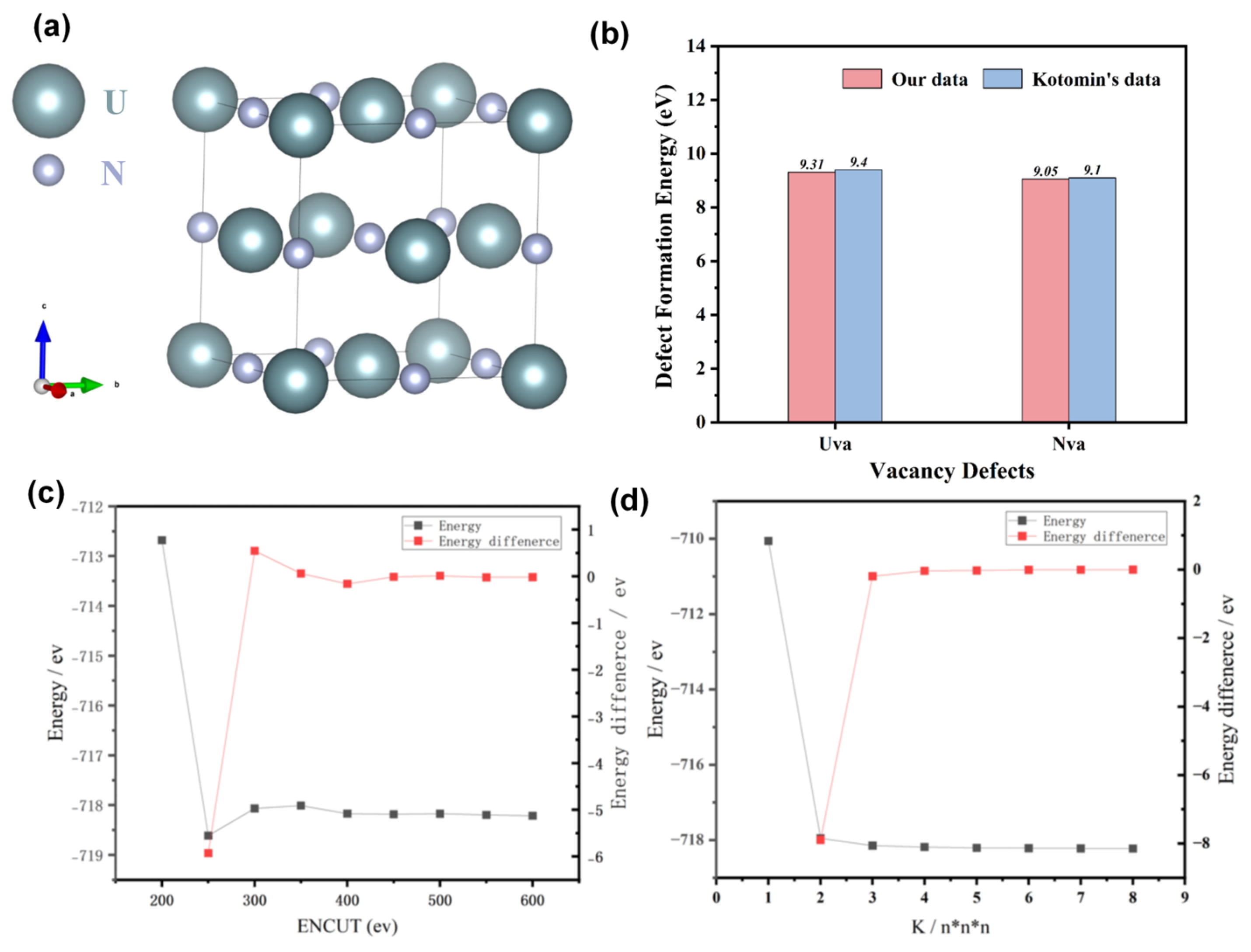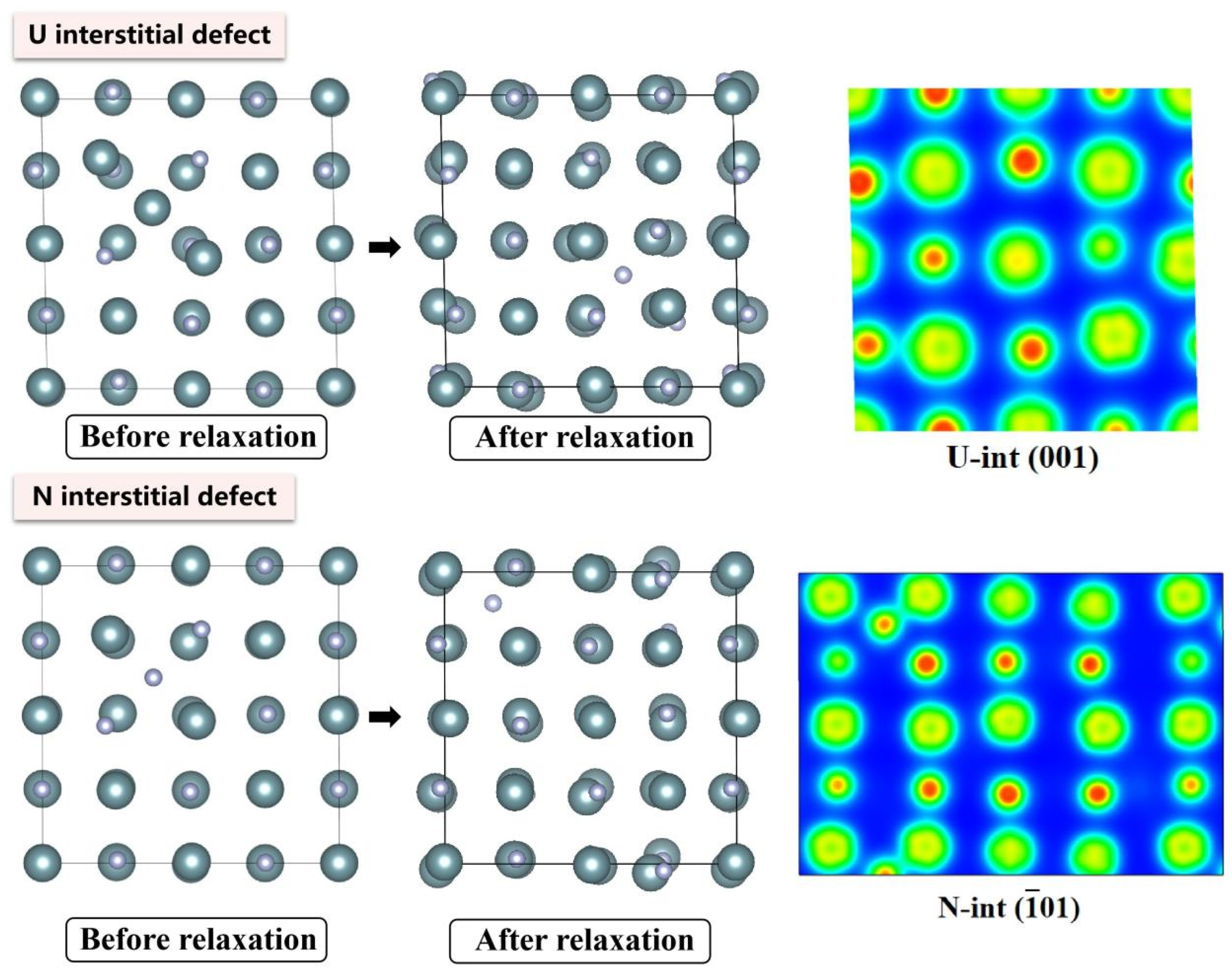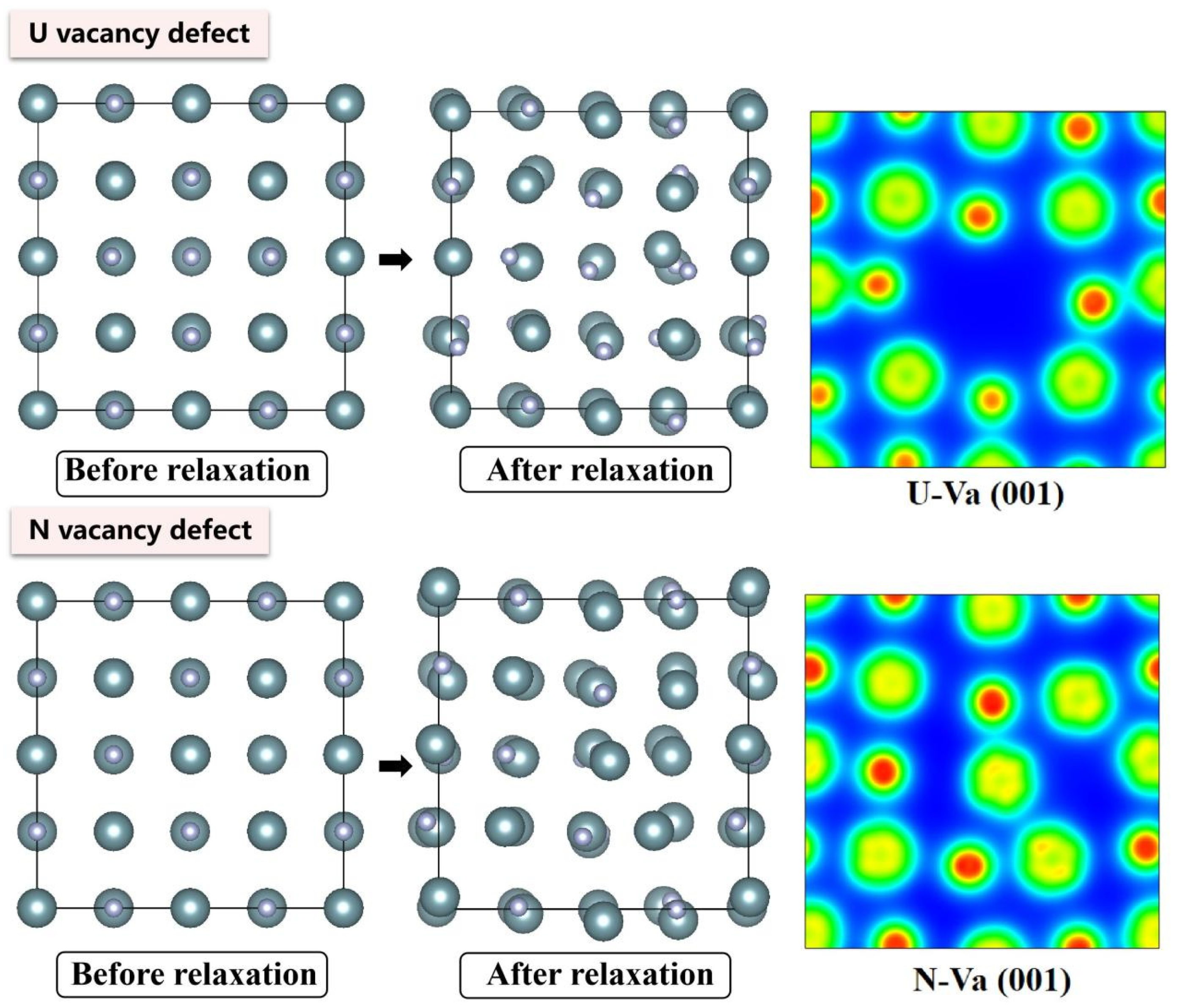 - At the 0 K absolute temperature, statistical analysis reveals that interstitial defects induce the most severe unit cell volume expansion in UN, followed by antisite defects, while divacancies and Schottky defects exert minimal influence on lattice expansion/contraction.