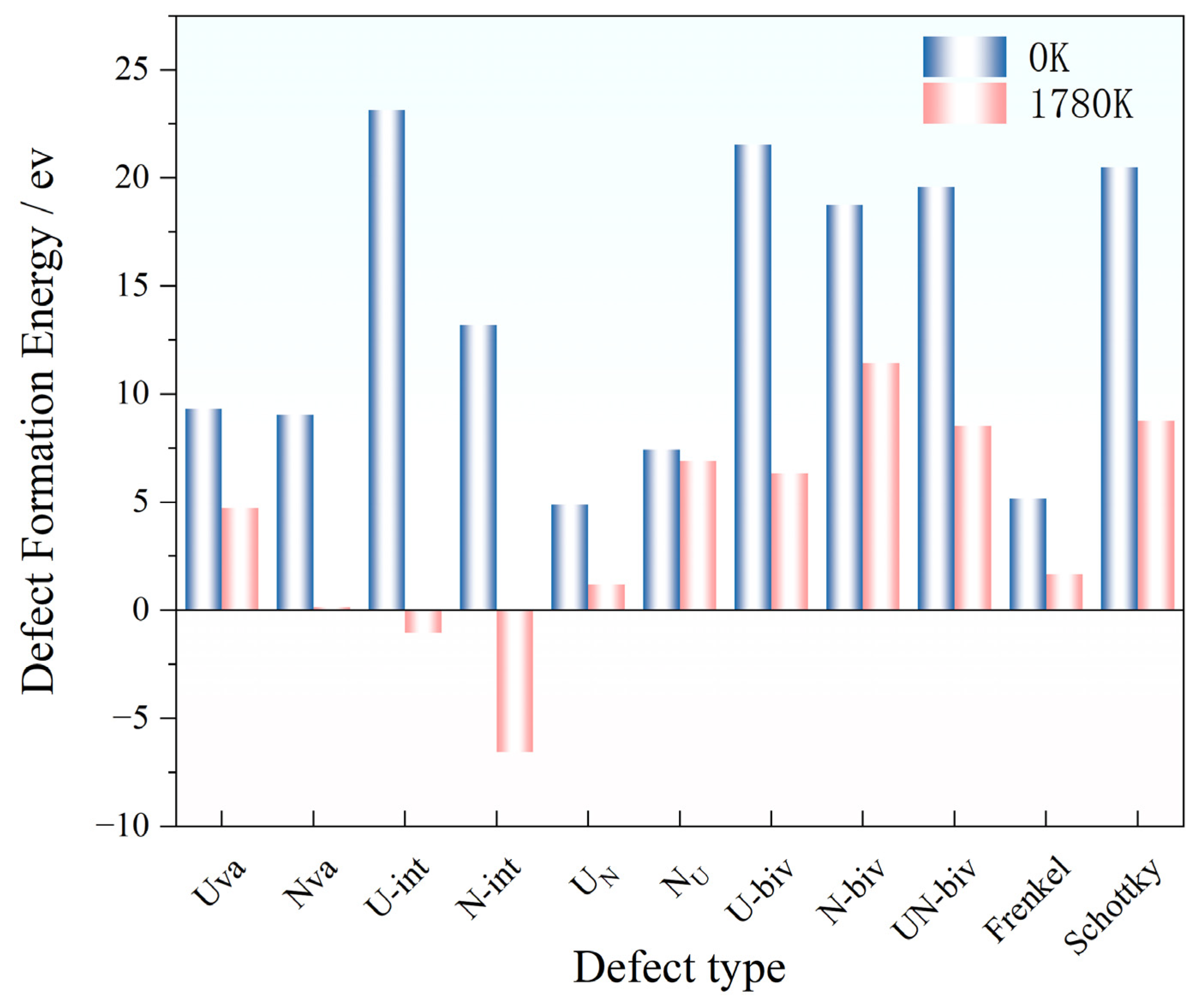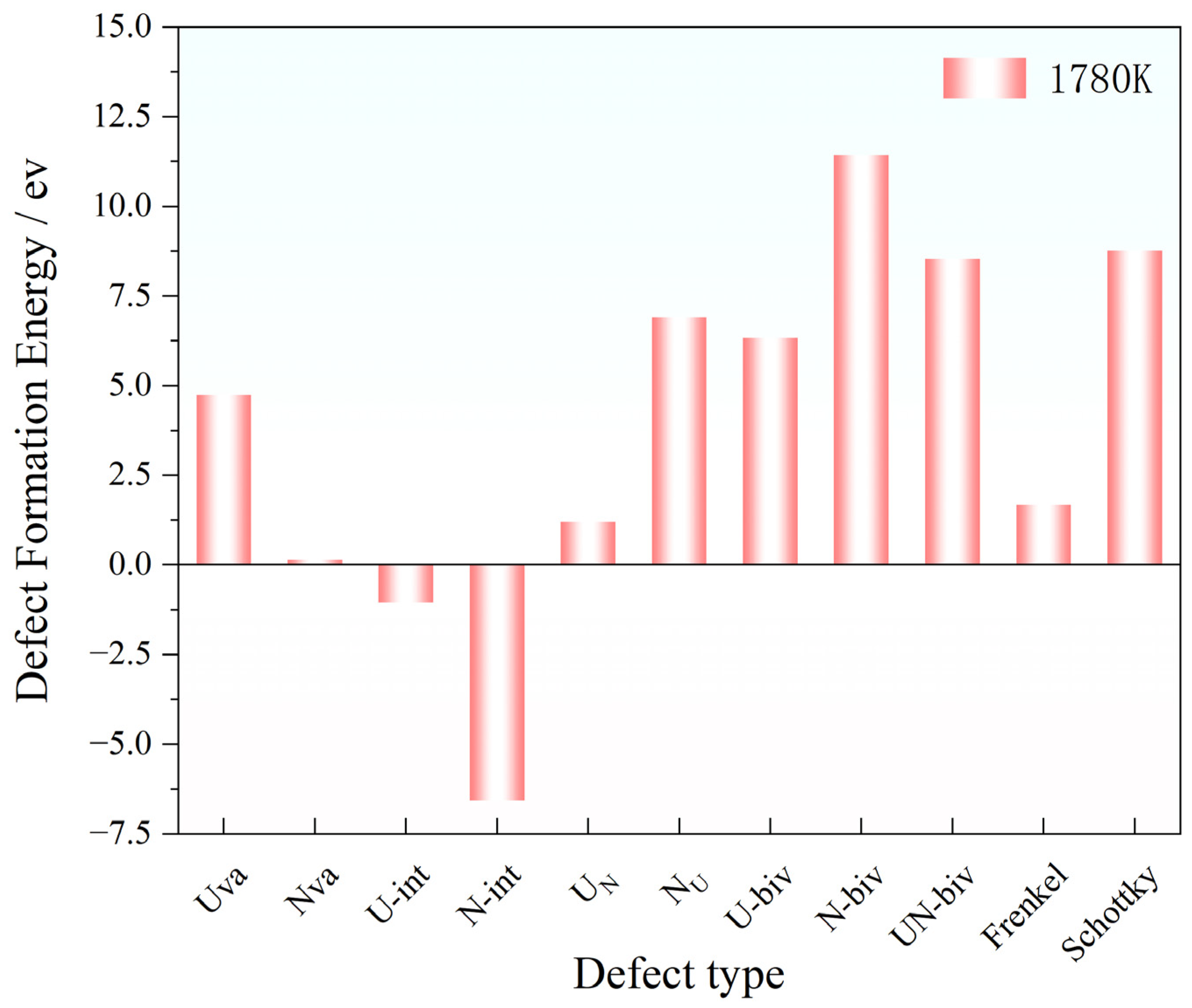 - At 1780 K, formation energies decrease significantly across all defect types, with interstitials and divacancies showing the most pronounced reductions. This confirms enhanced defect generation at high temperatures where thermal atomic motion provides the driving force.