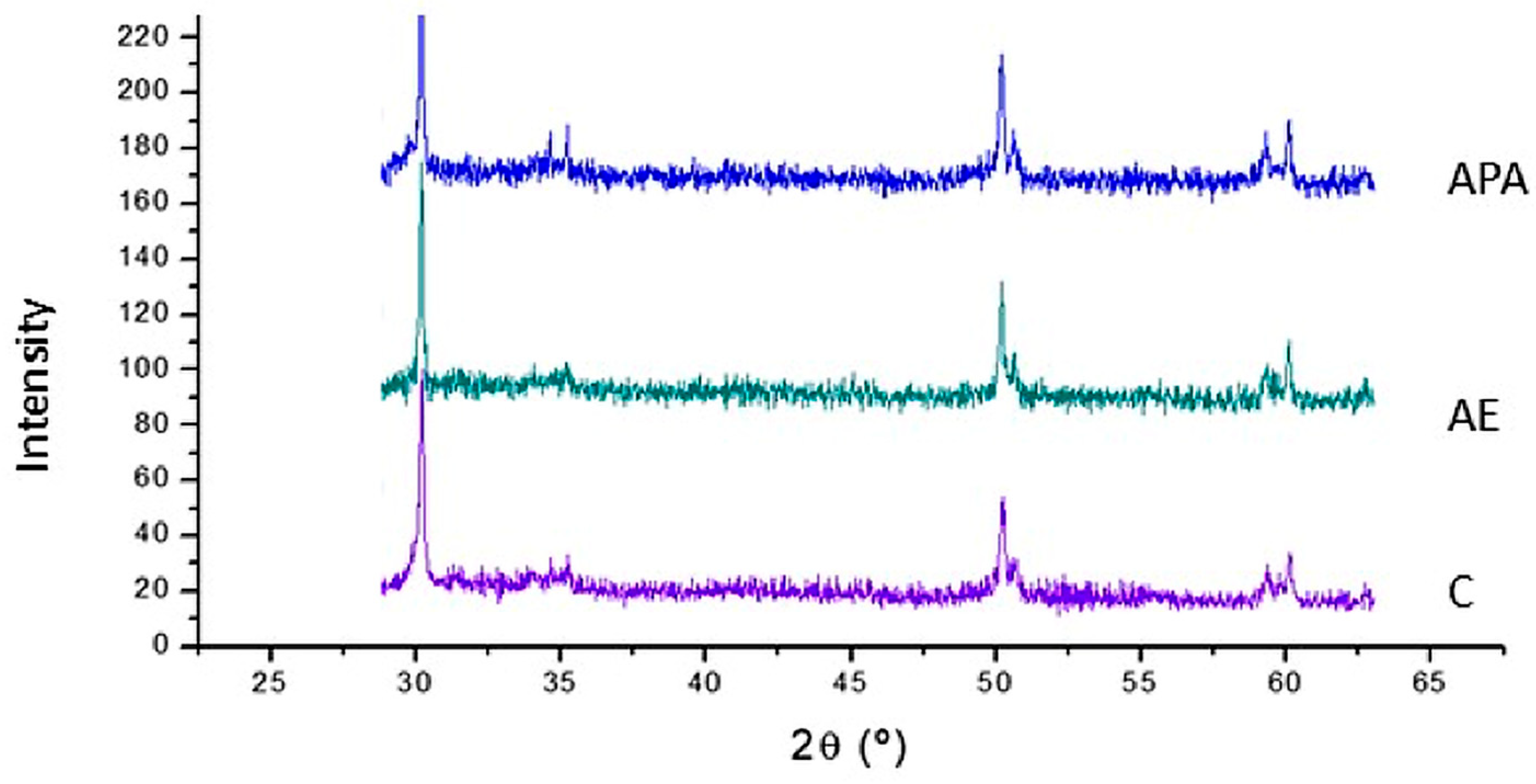 Finally, regarding wettability, the C group showed a contact angle of 99.7° (SD 4.3) and the APA group 98.2° (SD 3.1), while the acid-etched AE group exhibited a lower value of 87.6° (SD 4.2). No statistically significant differences were found between the C and APA groups, but both differed significantly from the AE group (