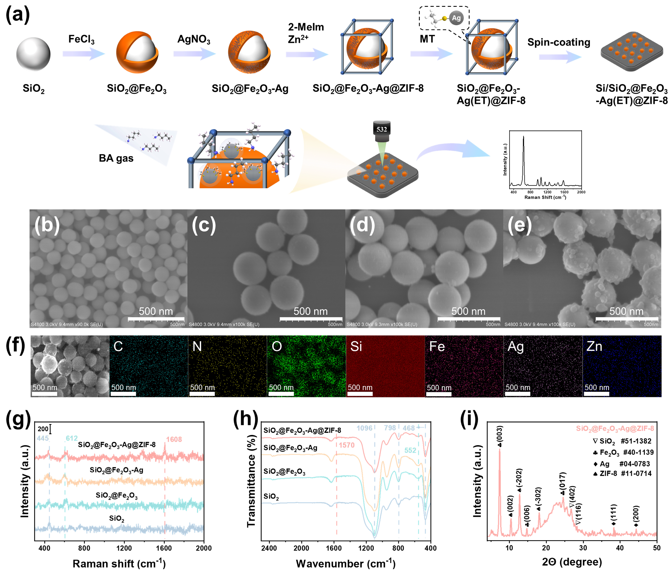 2.5. Synthesis of SiO2@Fe2O3-Ag@ZIF-8 [29]