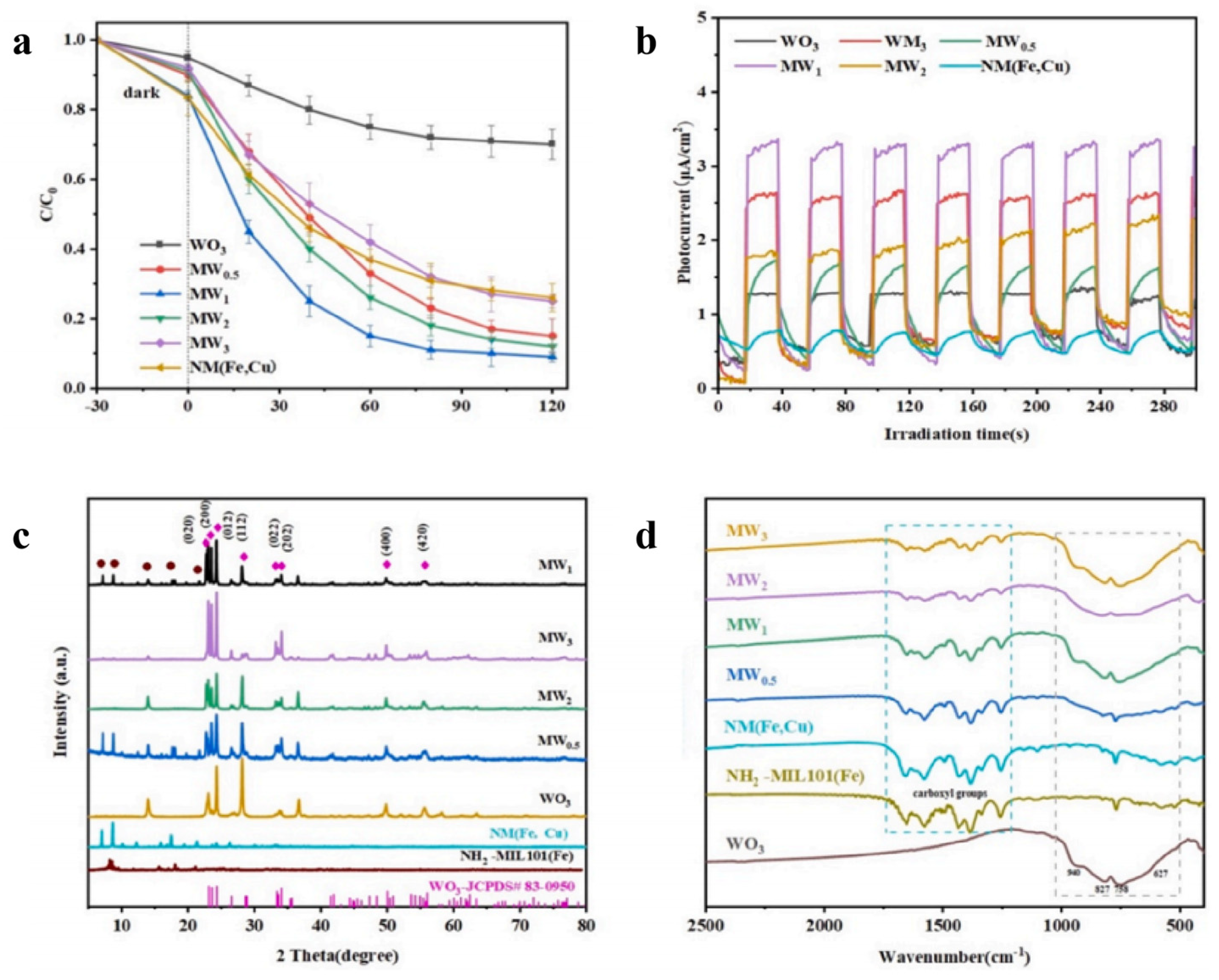 - Liu, Y.; Zhang, W.; Chi, W.; Liu, Y.; Chen, Y.; Liang, Y. A stabilized Z-type NH2-MIL101(Fe, Cu)/WO3 composite enhancing photo-Fenton like degradation of levofloxacin. Opt. Mater. 2025, 165, 117117. [Google Scholar] [CrossRef]