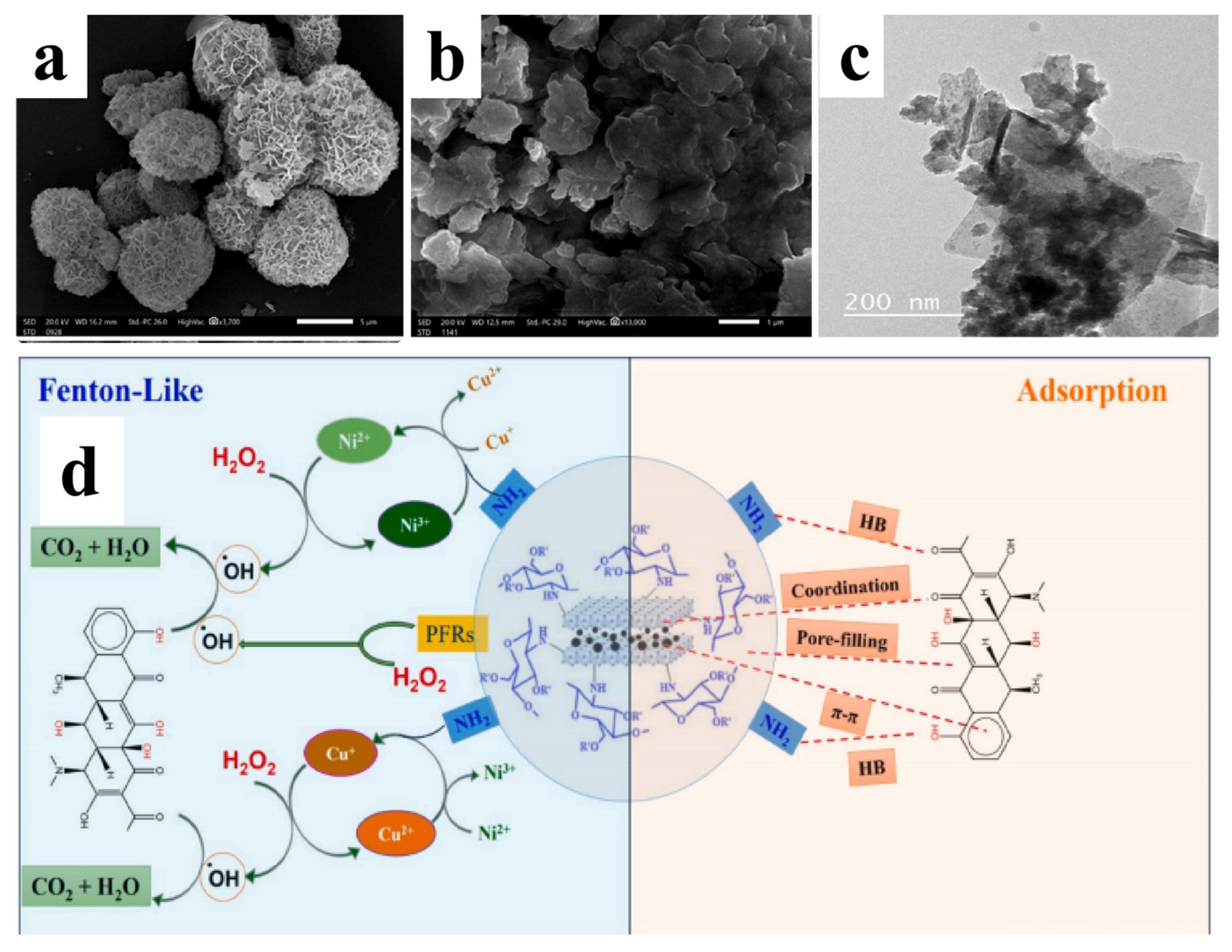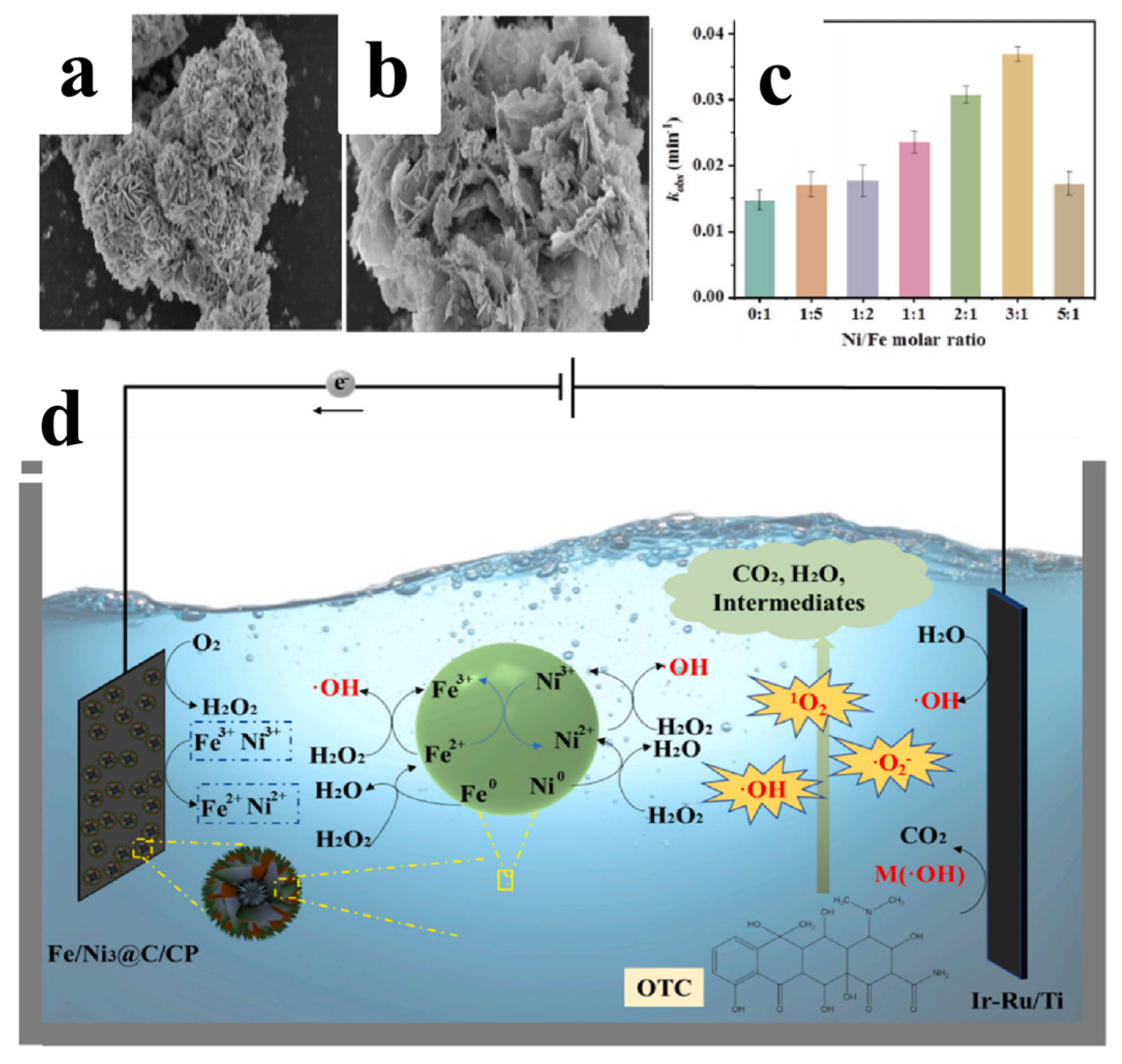 - Liu, E.; Hu, T.; Al-Dhabi, N.A.; Soyol-Erdene, T.O.; Bayanjargal, O.; Zuo, Y.; Wang, J.; Tang, W. MOF-derived Fe/Ni@C marigold-like nanosheets as heterogeneous electro-Fenton cathode for efficient antibiotic oxytetracycline degradation. Environ. Res. 2024, 247, 118357. [Google Scholar] [CrossRef]