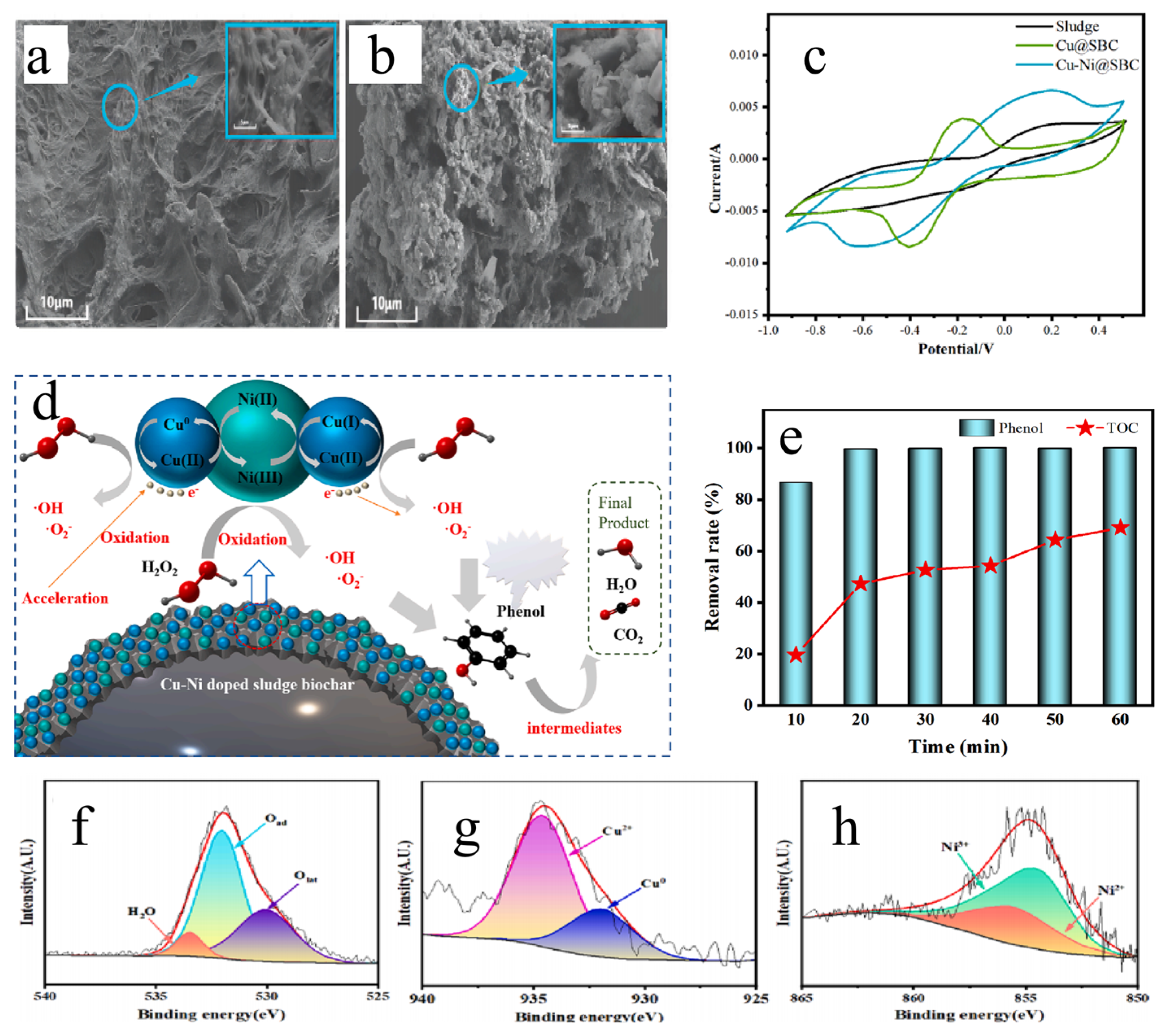 - Liu, Z.; Liu, Q.; Zhang, X.; Shi, B.; Qin, D.; Wang, J.; Zhang, A.; Liu, Y. Degradation of phenol by Cu-Ni bimetallic-doped sludge biochar as a fenton-like catalyst: Mechanistic study and practical application. Sep. Purif. Technol. 2024, 347, 127554. [Google Scholar] [CrossRef]