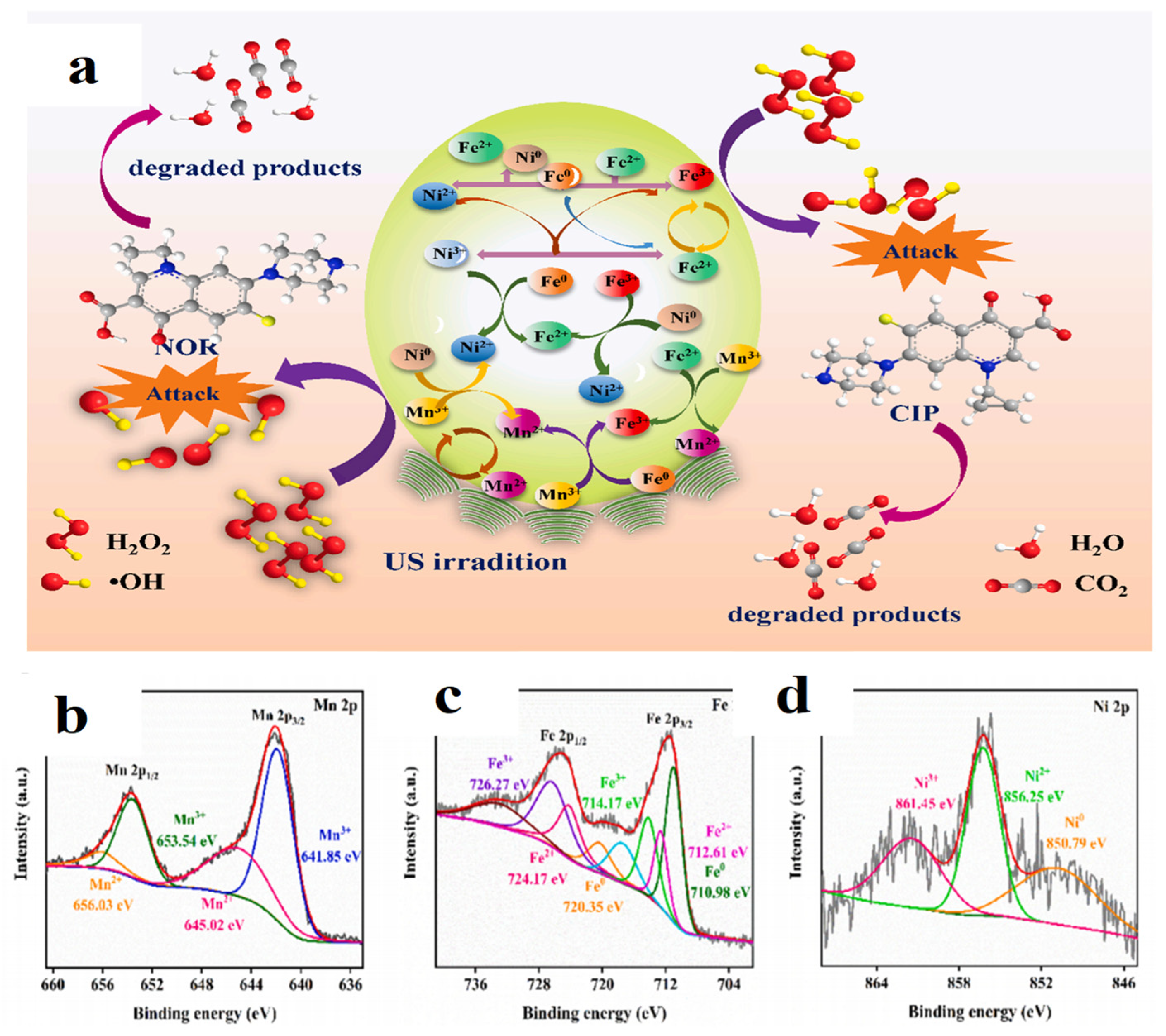 - Dang, G.; Jia, Y.; Guo, L.; Yang, Y.; Zhi, J.; Li, X. Tannin-functionalized Mn3O4 as support for FeNiB alloy to construct sono-Fenton-like reaction for the degradation of antibiotic pollutants in water. Colloids Surf. A Physicochem. Eng. Asp. 2023, 663, 131088. [Google Scholar] [CrossRef]