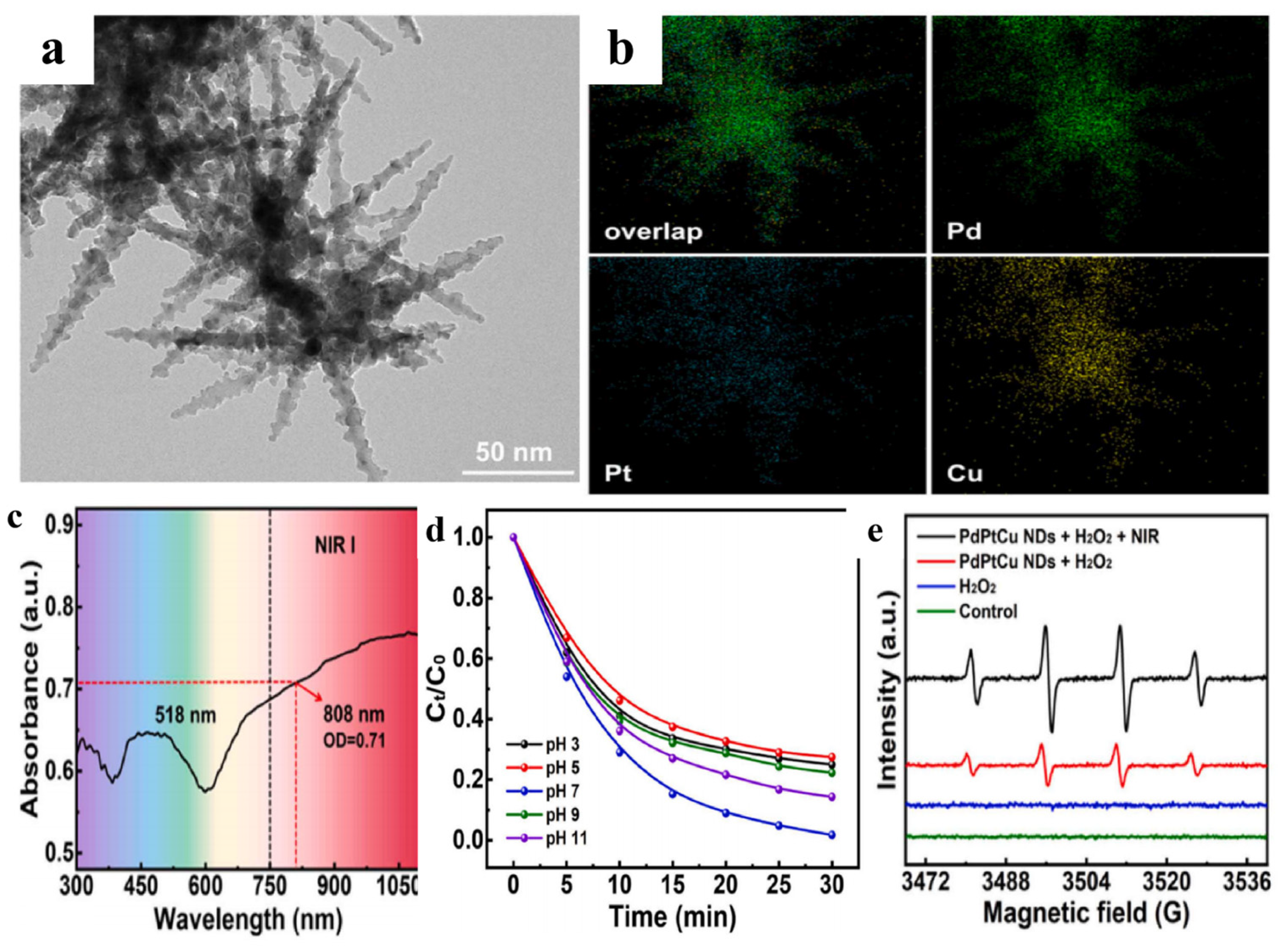 - Zhang, J.; Zhong, Y.; Feng, Y.; Chen, M. Nano-dendritic PdPtCu alloys for efficient dye degradation through plasmon-enhanced Fenton-like reaction. J. Alloys Compd. 2025, 1044, 184427. [Google Scholar] [CrossRef]