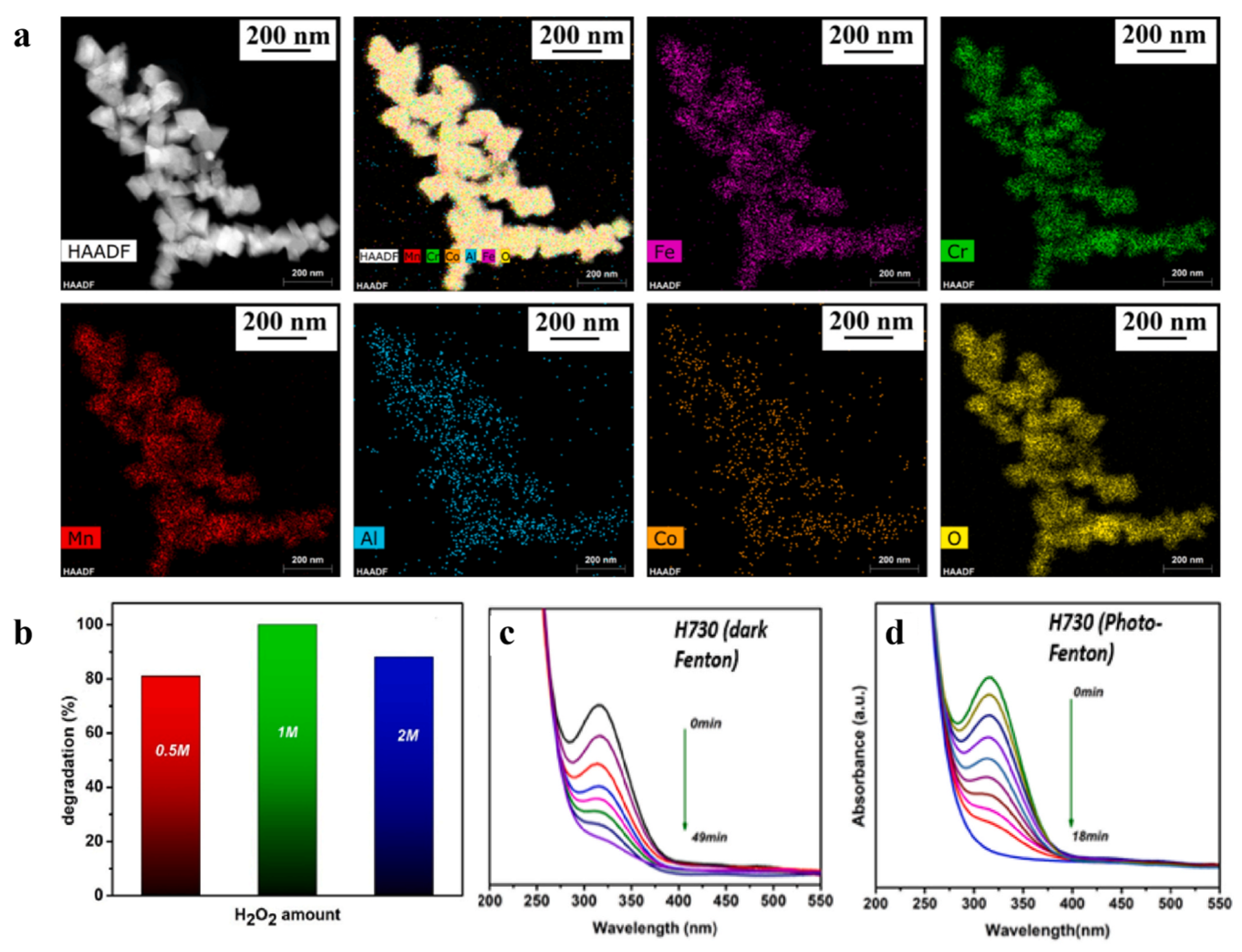 - Sachan, D.; Singh, N.; Kumar, U.; Kuntail, J.; Sinha, I.; Singh, R. Design of medium entropy oxide for photo-Fenton catalytic degradation of tetracycline. Mol. Catal. 2025, 582, 115187. [Google Scholar] [CrossRef]