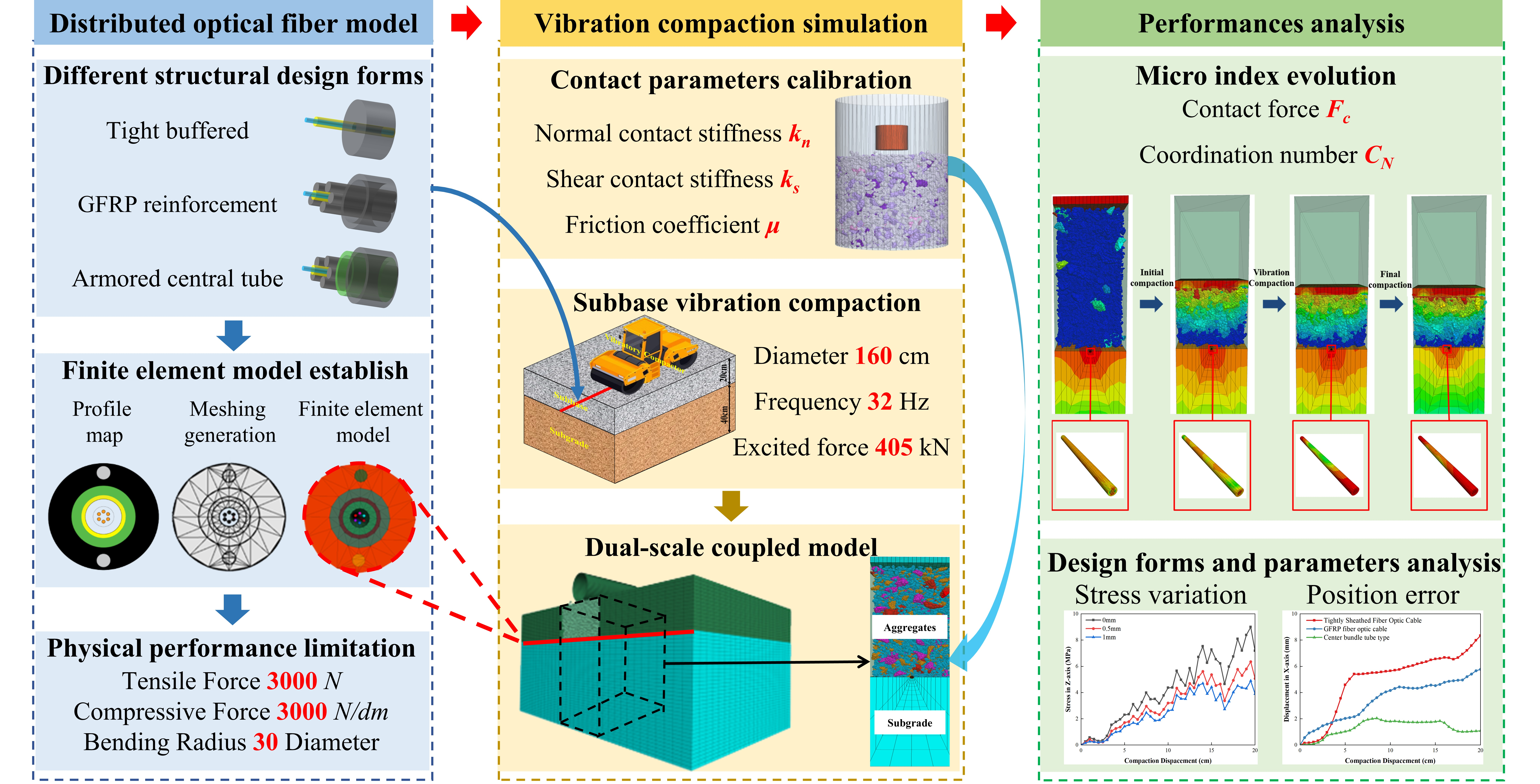To investigate the performance change in optical fiber sensor during pavement construction, DEM-FDM (combining the discrete element method with the finite difference method) was utilized for dual-scale coupled numerical simulation. Considering the discrete characteristics of graded aggregates, the discrete element software Particle Flow Program (PFC3D, version 7.0) was used to describe the graded aggregates and finite differential software Fast Lagrangian Analysis of Continuum (FLAC3D, version 7.0) to describe DFOS to establish the coupling model of a distributed fiber sensor embedded in a pavement structure. In order to represent the most unfavorable pavement construction conditions, the distributed fiber sensor was located on the top of the subgrade. Under vibratory compaction of the pavement subbase, the effects of cable structural design form and size on the mechanical performances and the spatial position error of optical cable were analyzed. The results can provide references for pavement construction integrated DOFS sensor deployment.