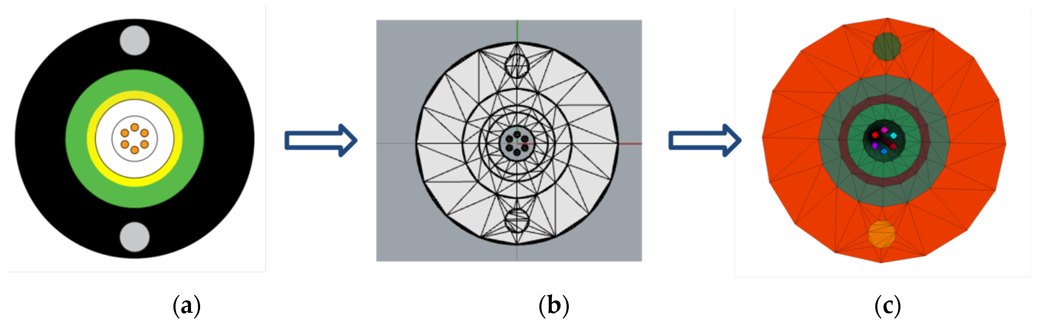 Figure 1a. The DWG file was subsequently imported into the 3D modeling software Rhinoceros (v.7.0 by McNeel & Associates, Seattle, WA, USA). The NURBS plugin in Rhino, with the rotation formation command, was employed to construct a 3D model of a fully triangular curved mesh optical cable with a minimum edge size of 0.1 m, as shown in