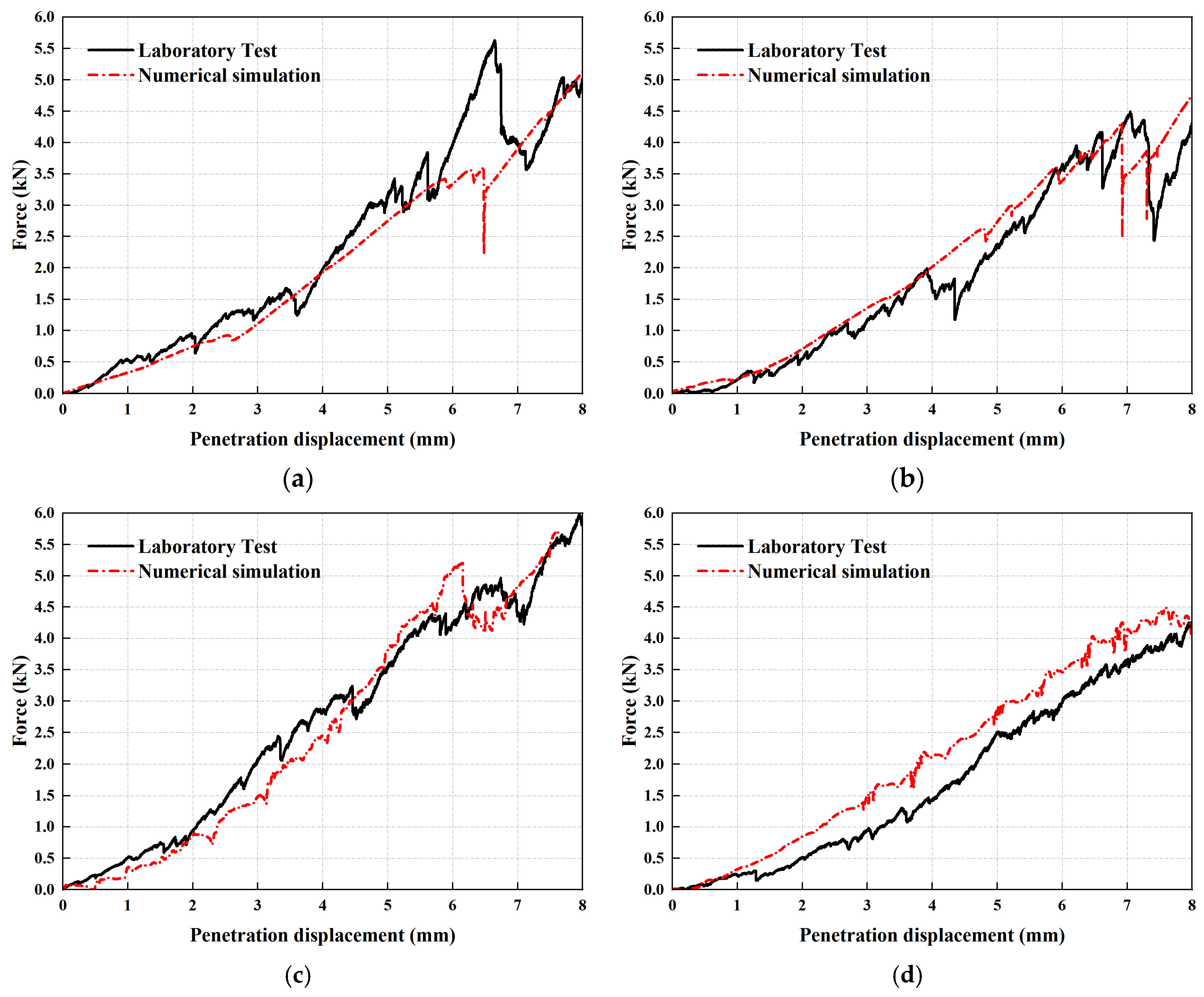 Figure 5 presents the comparison of force–displacement curves between the laboratory standard penetration test and the numerical simulation. The results presented in