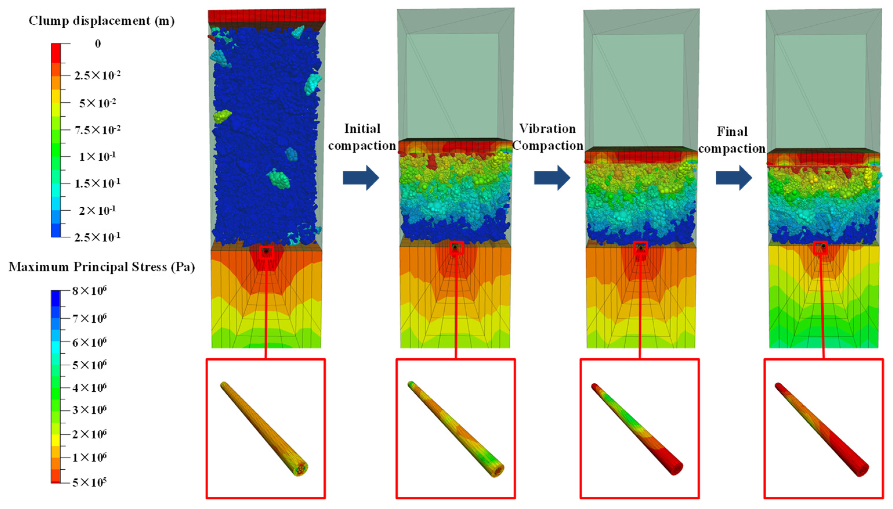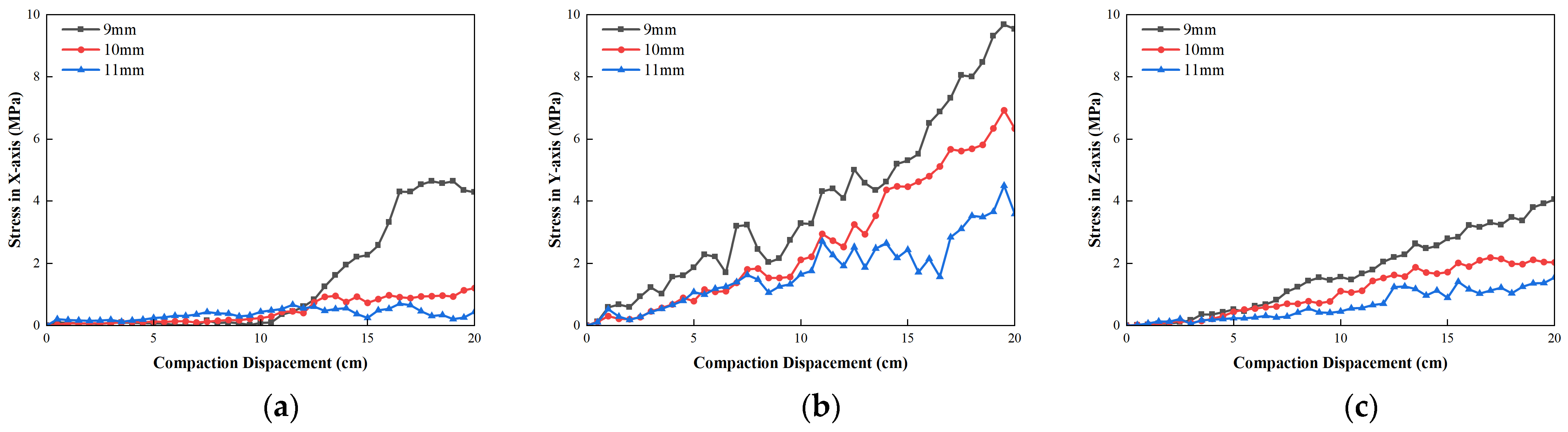 Table 3. Before applying the loading plate, the displacements and velocities of all discrete-element particles in the graded aggregates were reset to zero to initialize the state variables. The excitation force was applied to the loading plate, and compaction was terminated once the compaction height reached the prescribed subbase thickness of 20 cm for the national expressway segment.