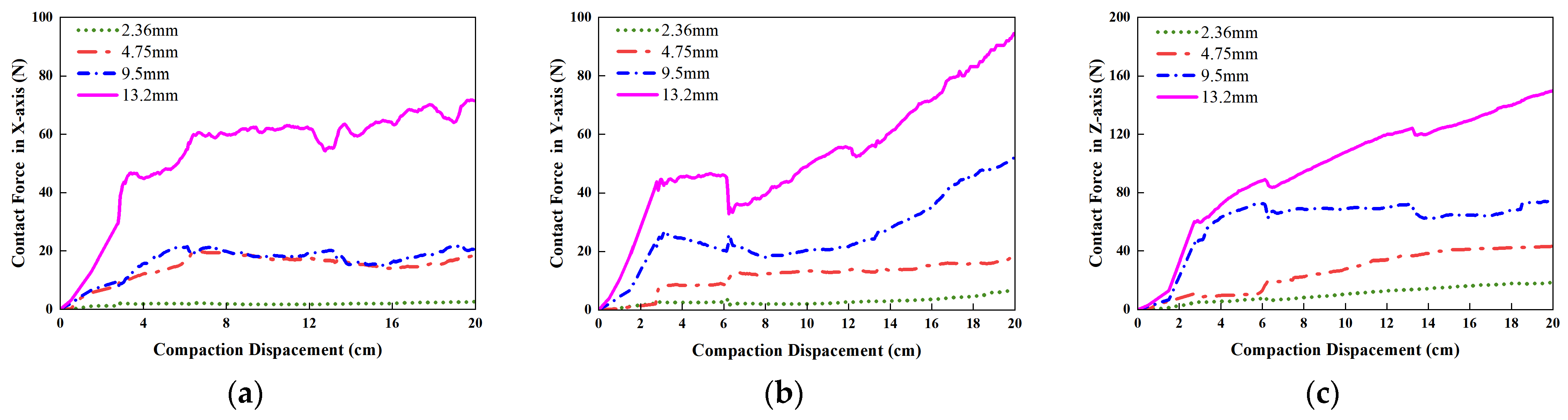 Z-direction exceeds 150 N. In contrast, the contact forces of the other three gradation do not exceed 50 N. It illustrates that the contact forces in the corresponding direction diminish progressively with decreasing particle diameter. The contact forces between large particles are considerably higher than that between small particles, which is the main resistance of the external load.