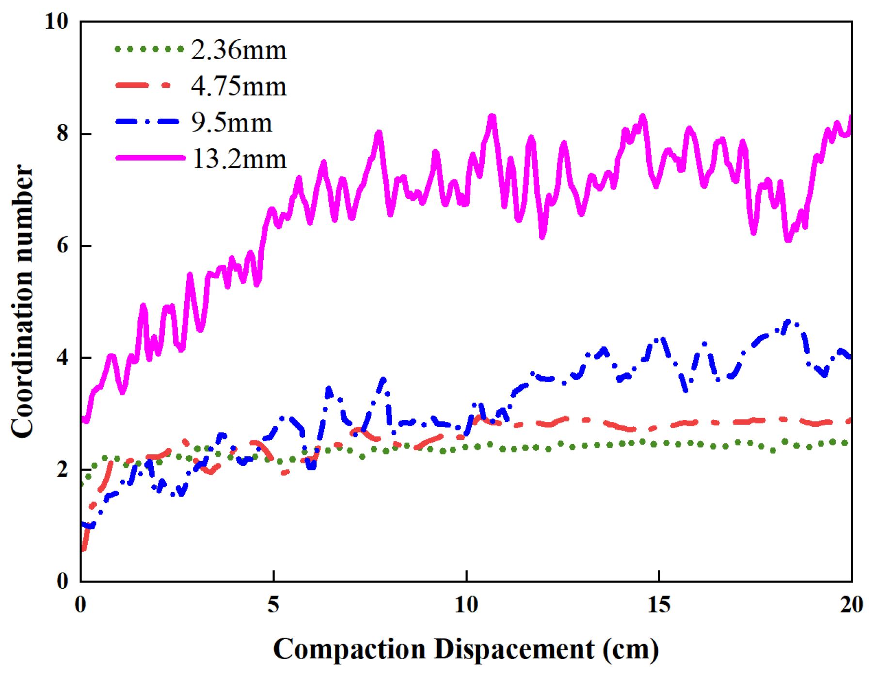 Figure 9 shows the evolution law of the coordination number of different particle sizes during the vibrational compaction process. Similar to the aforementioned contact force variation, the aggregate coordination number decreases gradually with the decrease in particle diameter. In the four gradations of aggregates, the 13.2 mm aggregates has the most significant change, followed by 9.5 mm, 4.75 mm and 2.36 mm aggregates. The final coordination number of total model is about 8 and always slowly increases with compaction. The curves of the average coordination number and the contact force exhibited a consistent trend. The coordination number of the coarse aggregate particles increased significantly to yield larger values. It indicated that the coarse particles served as the primary load-bearing components under external vibratory loading.